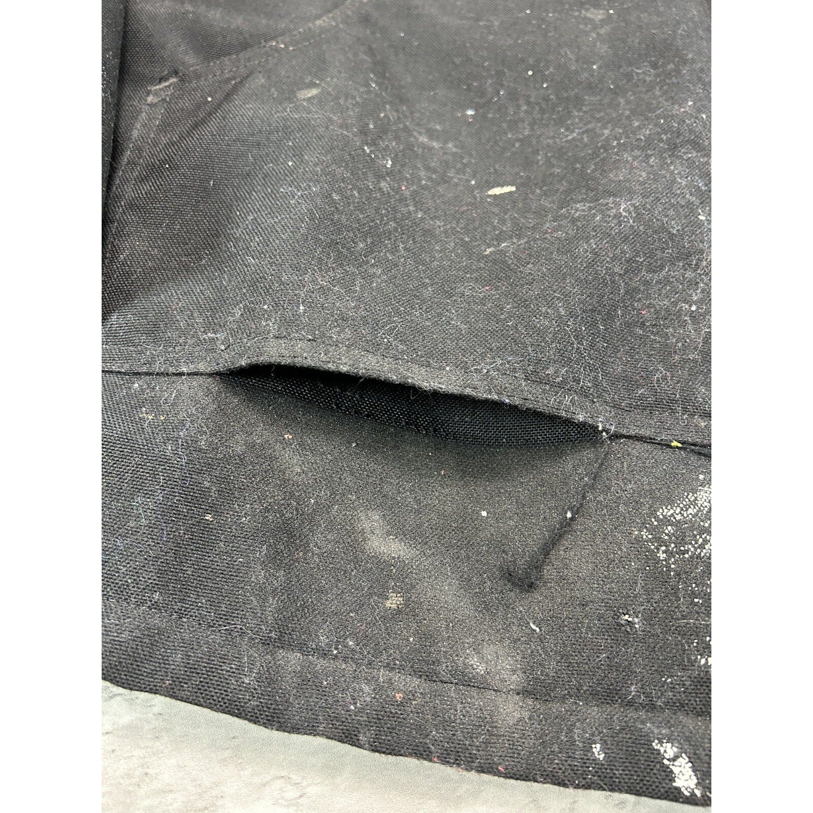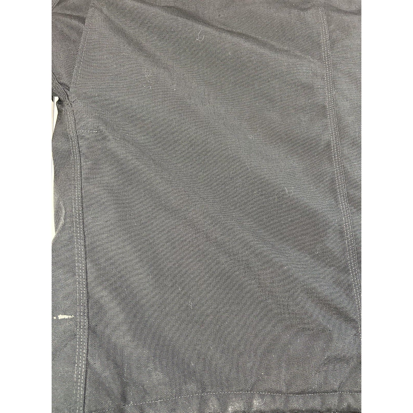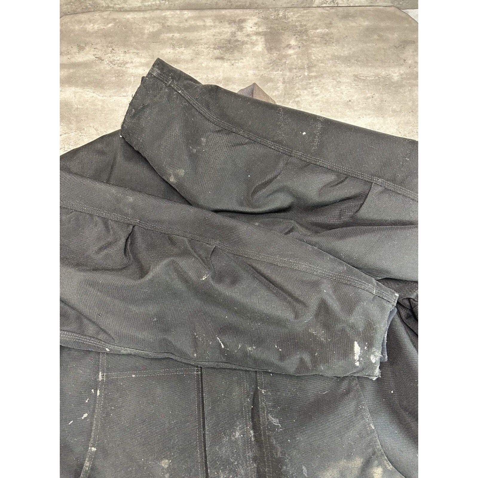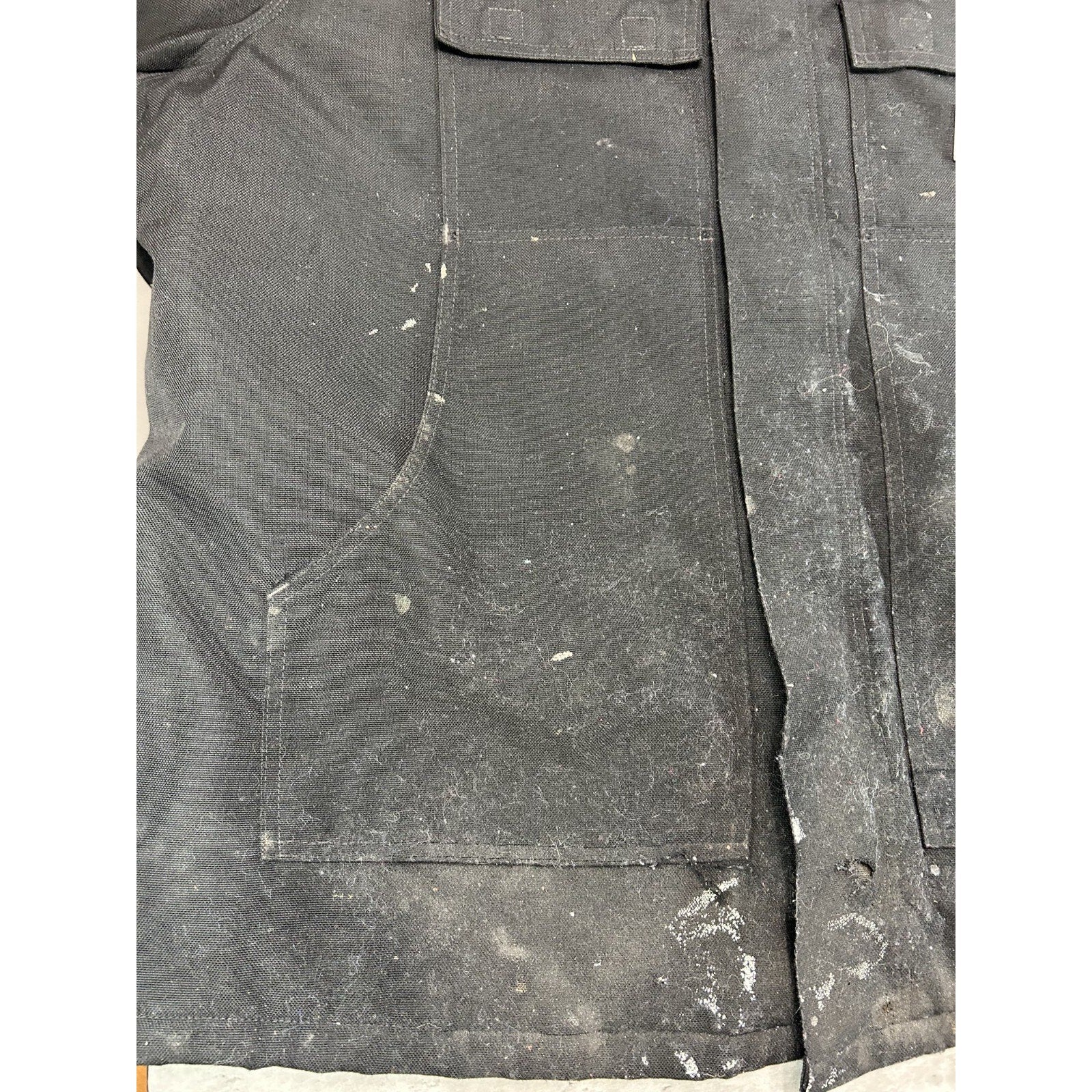 Wear due to age. Marks, paint marks, adhesive residue, pinholes, tears, loose threads, fraying and distressing all found throughout. Tear on bottom right pocket. Material was burnt in places.