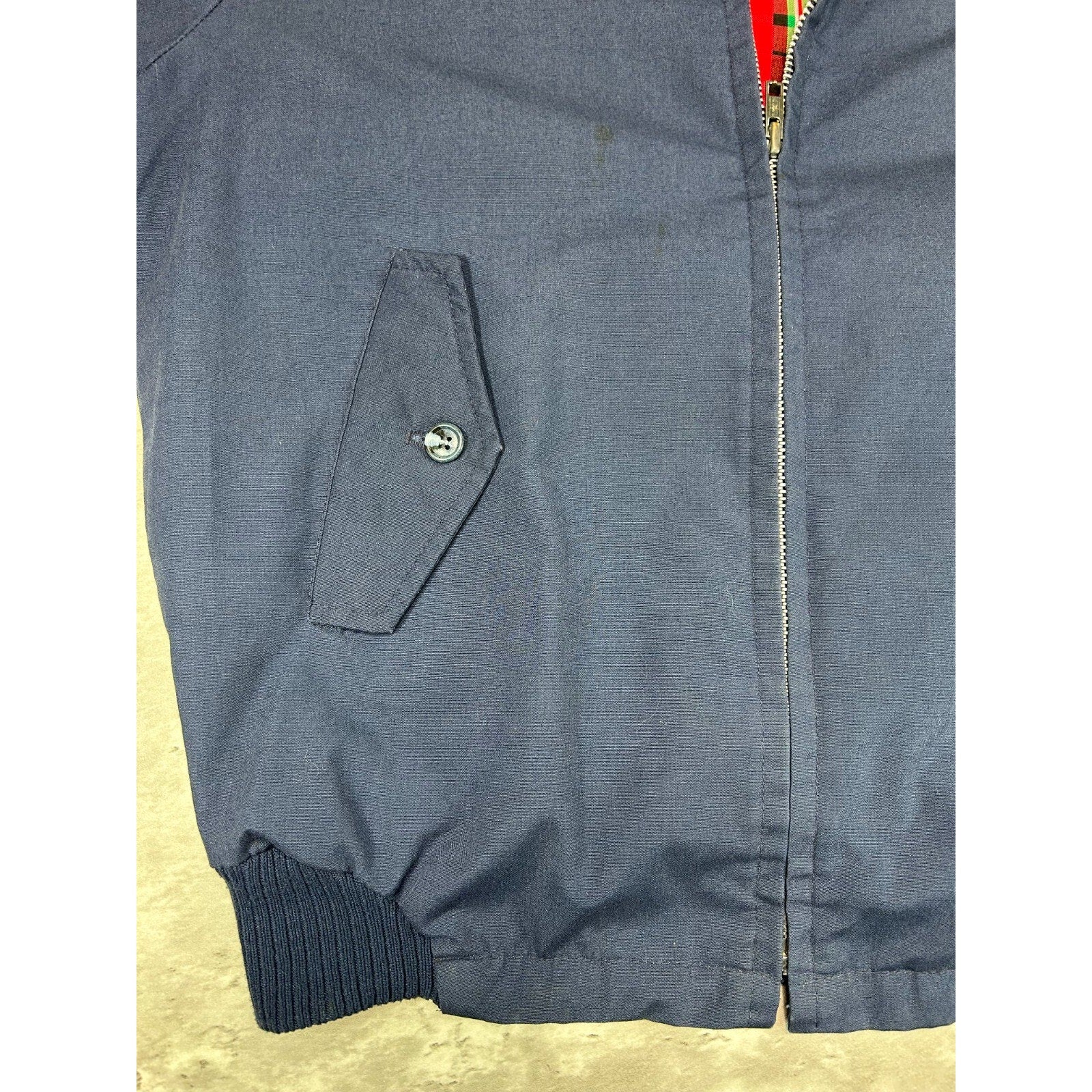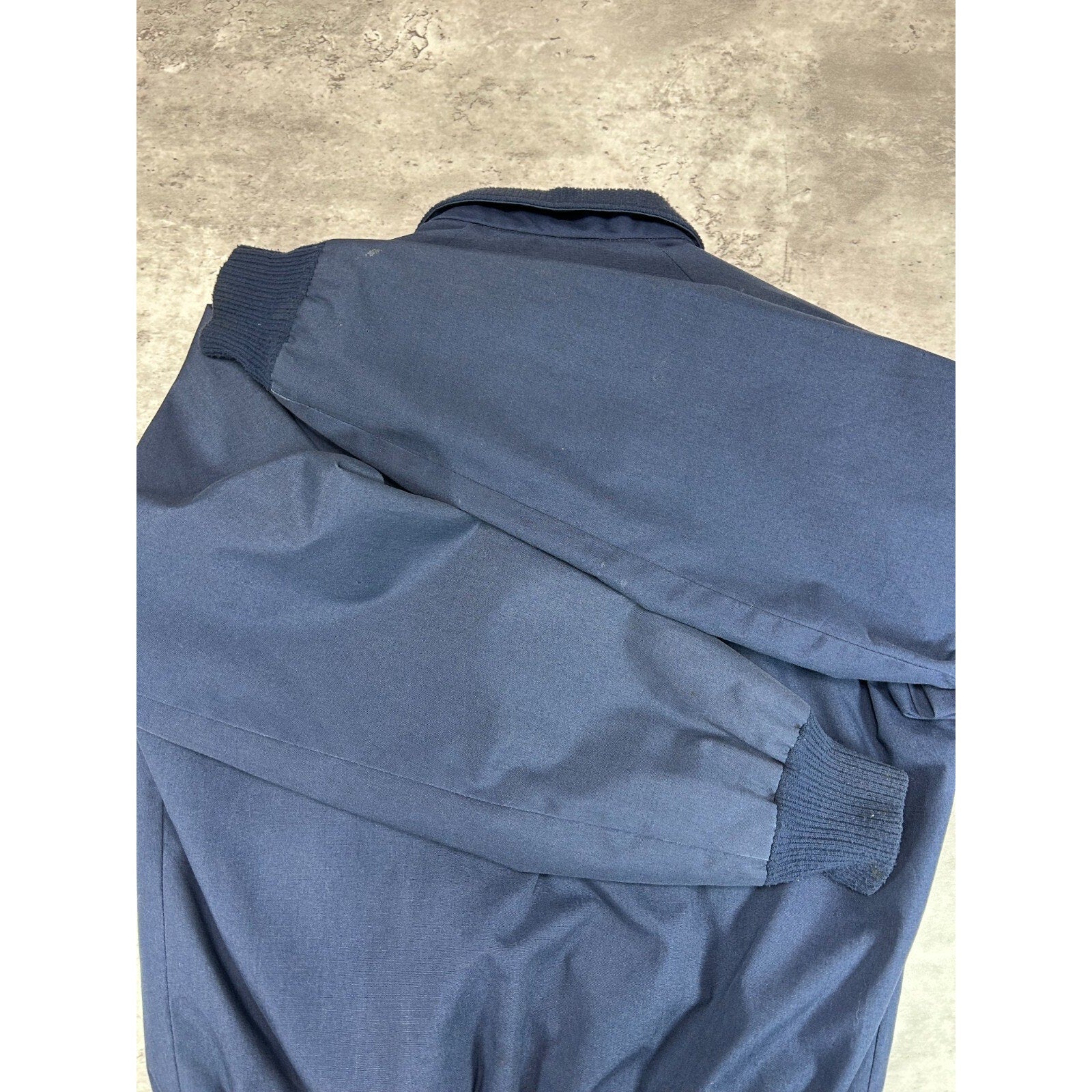 General wear due to age. Light marks found around. Pilling on collar, cuffs, and waistband.