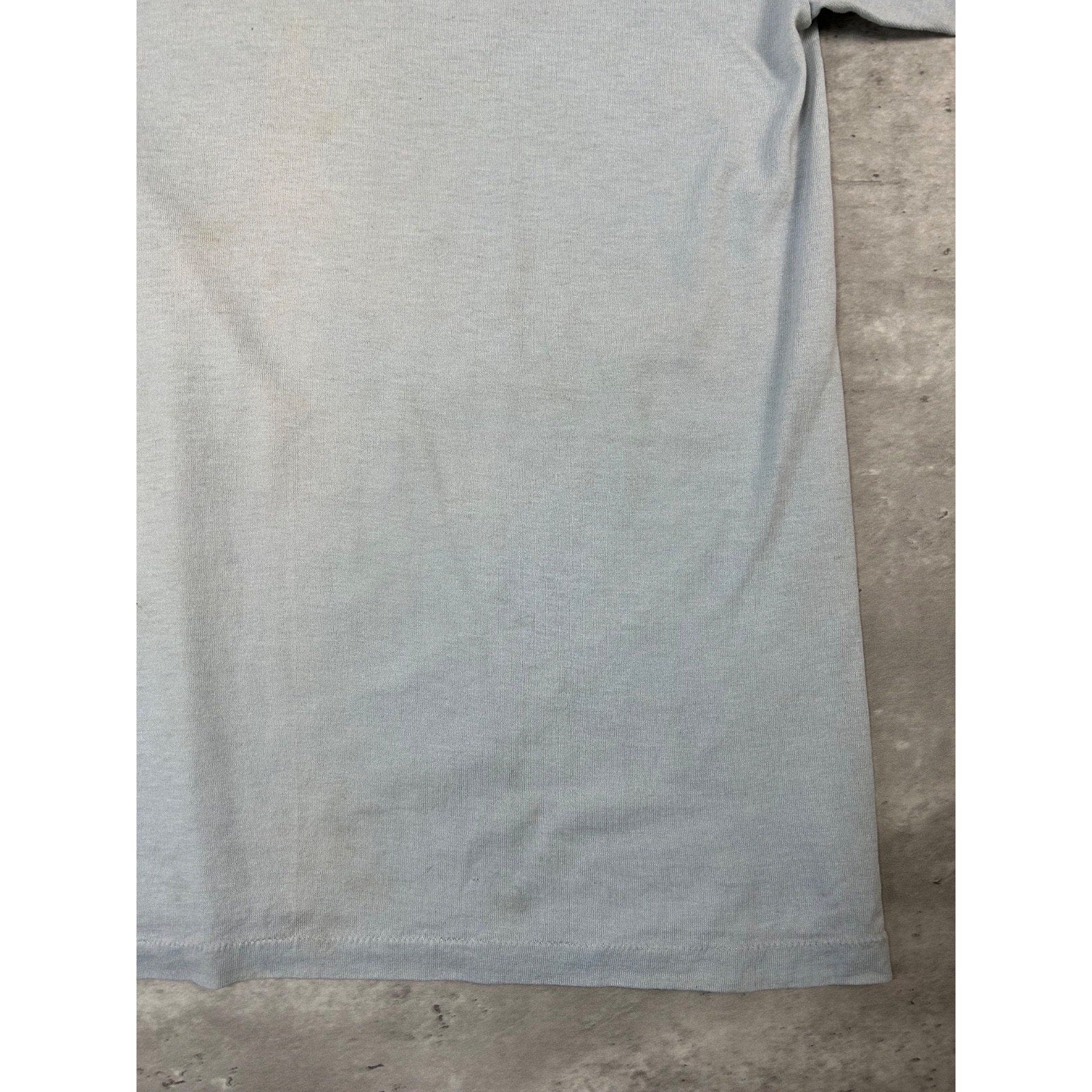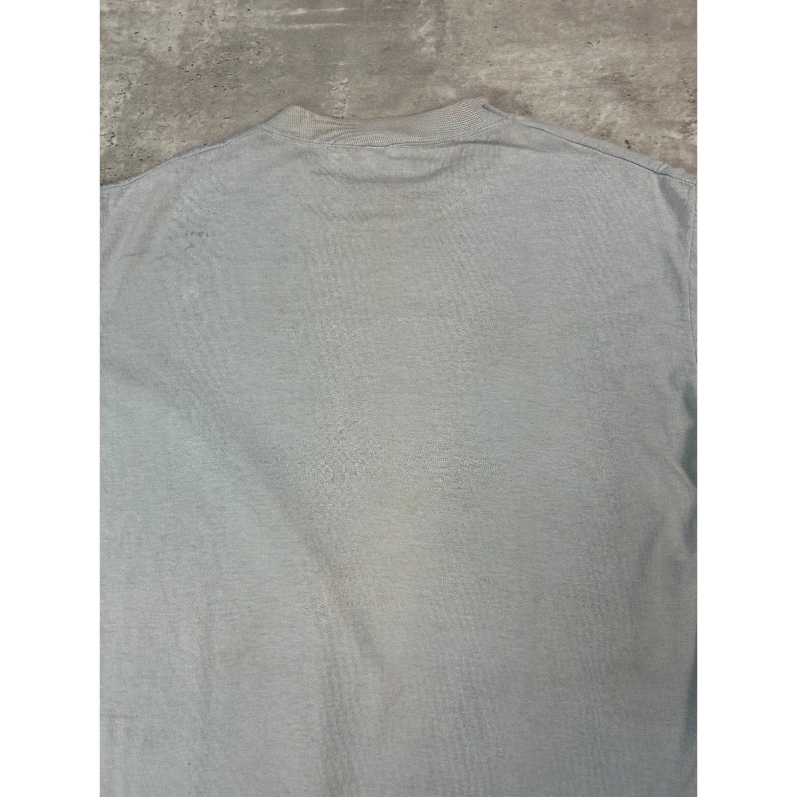 Wear, fading, and material thin due to age. Yellowing on collar and under pits. Tear on front near graphic. Fading on graphic.