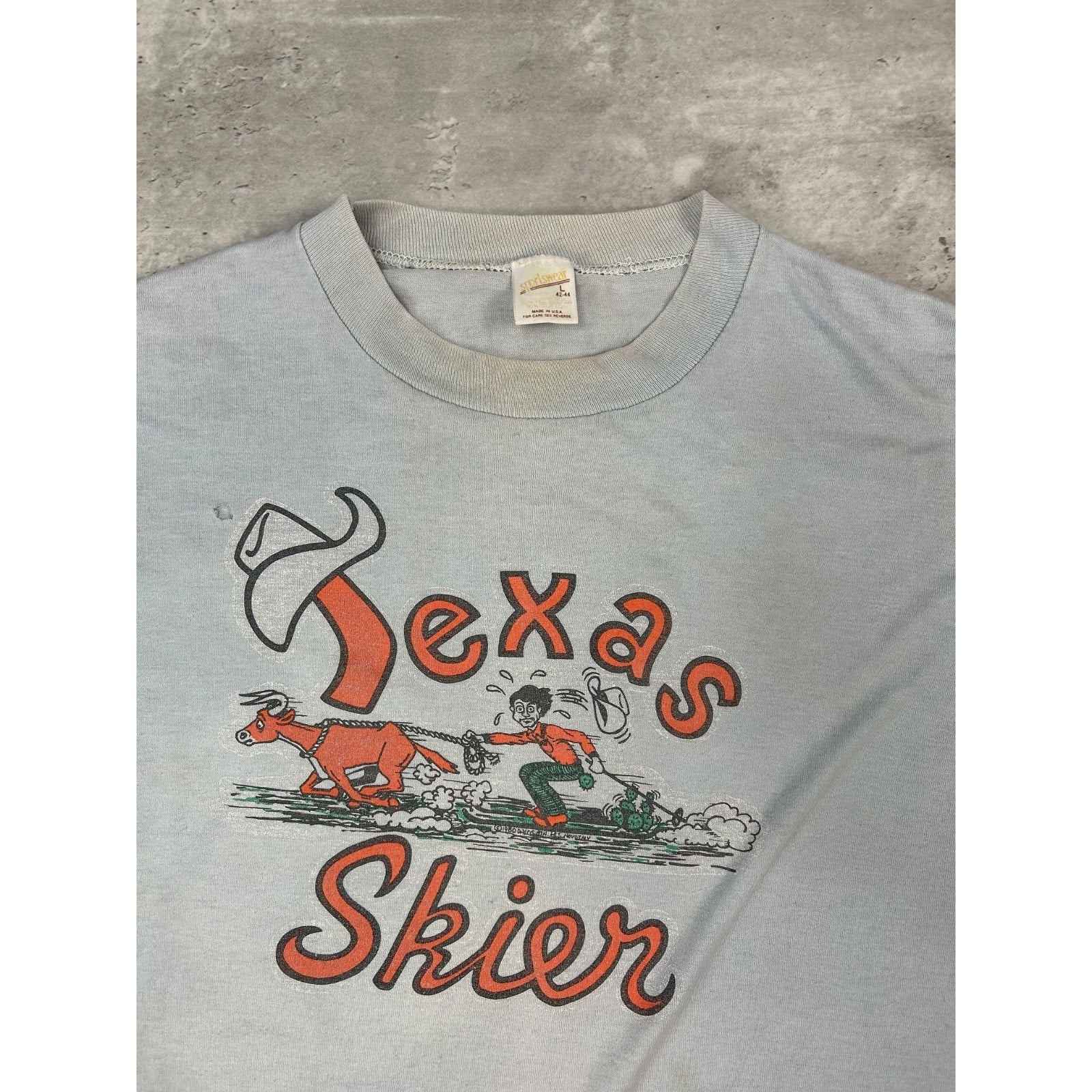 Vintage 1980 Texas Skier Western Spellout Graphic T-Shirt Size Large Blue