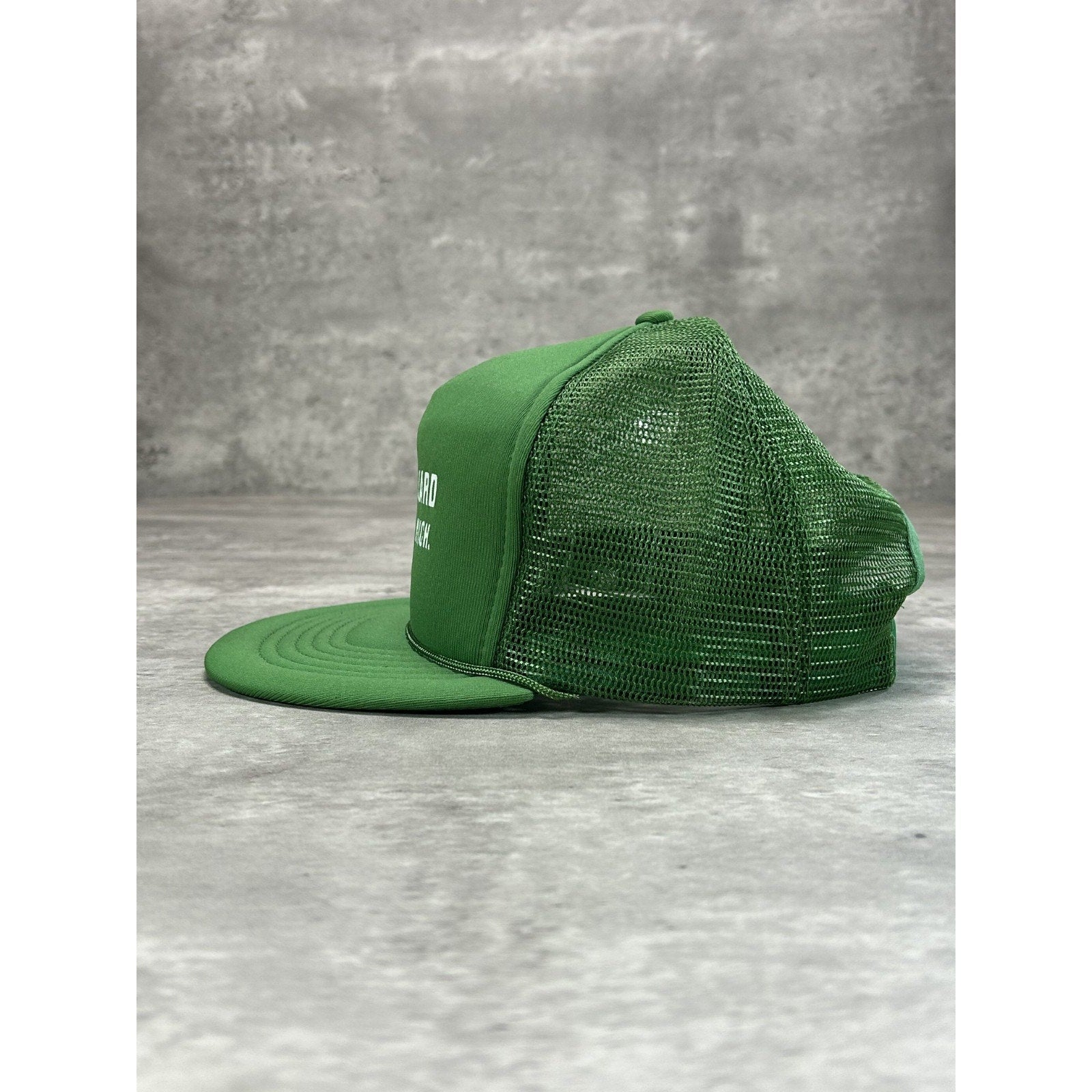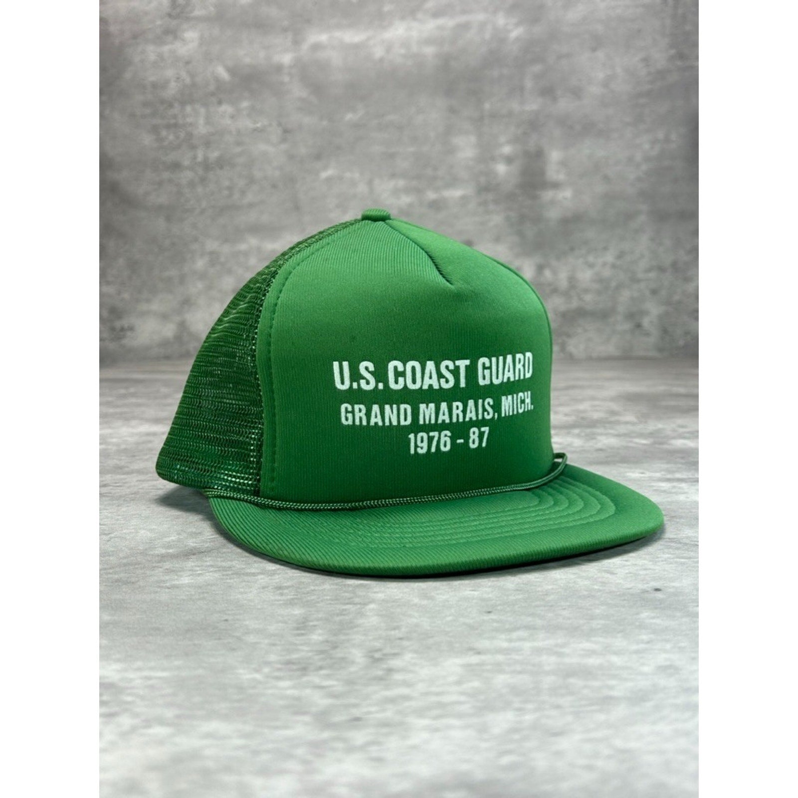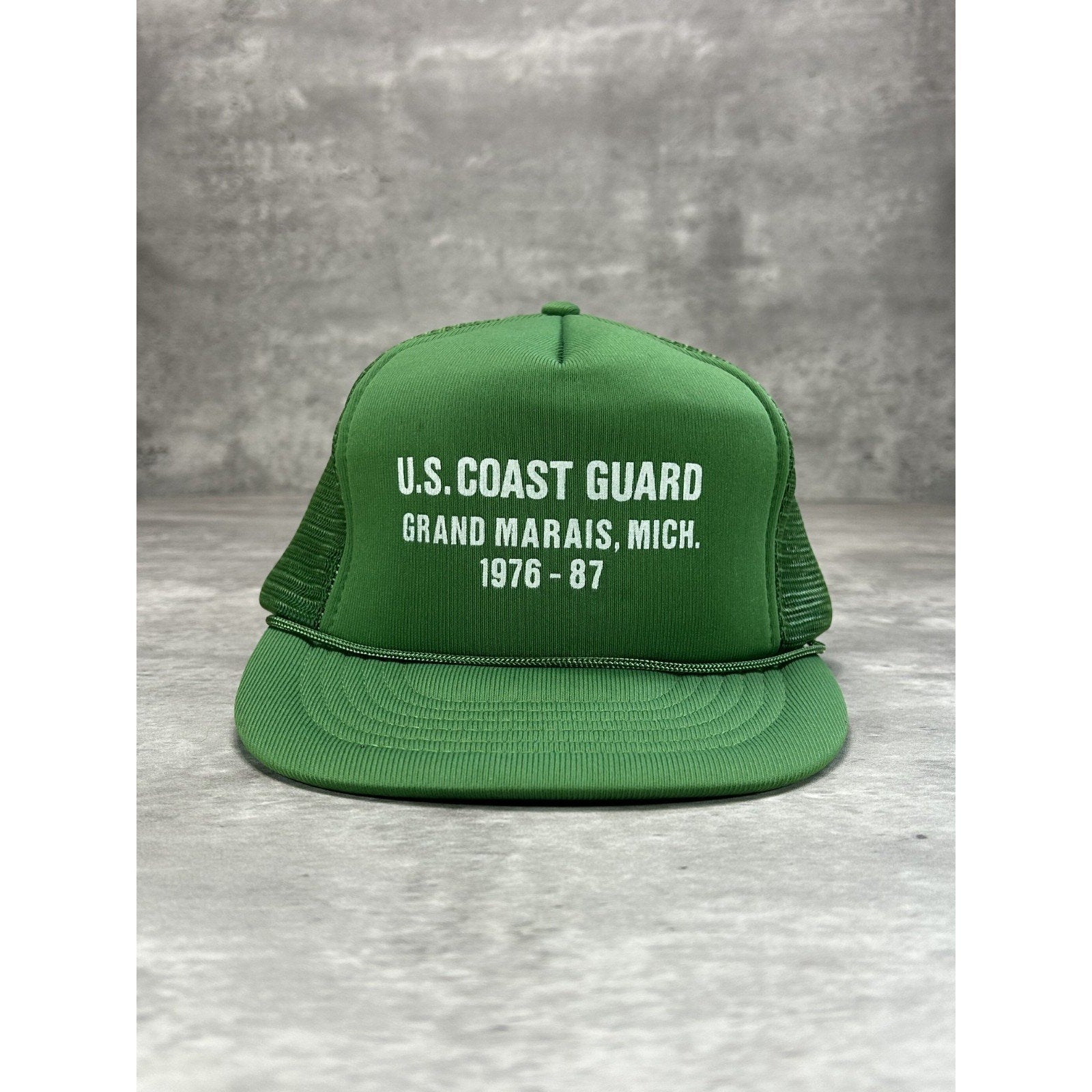 Vintage 1987 US Coast Guard Graphic Spellout Trucker Snapback Hat OSFA Green