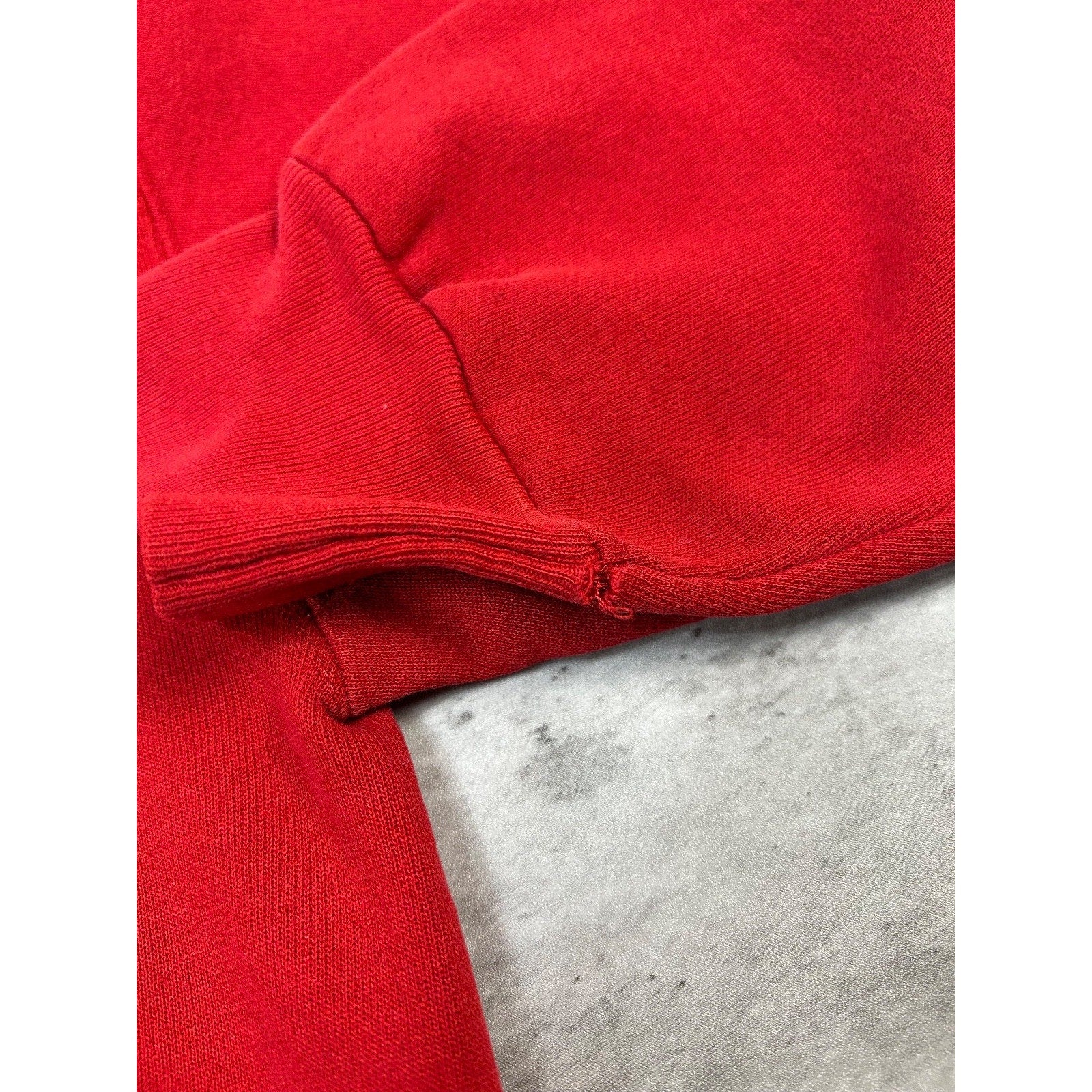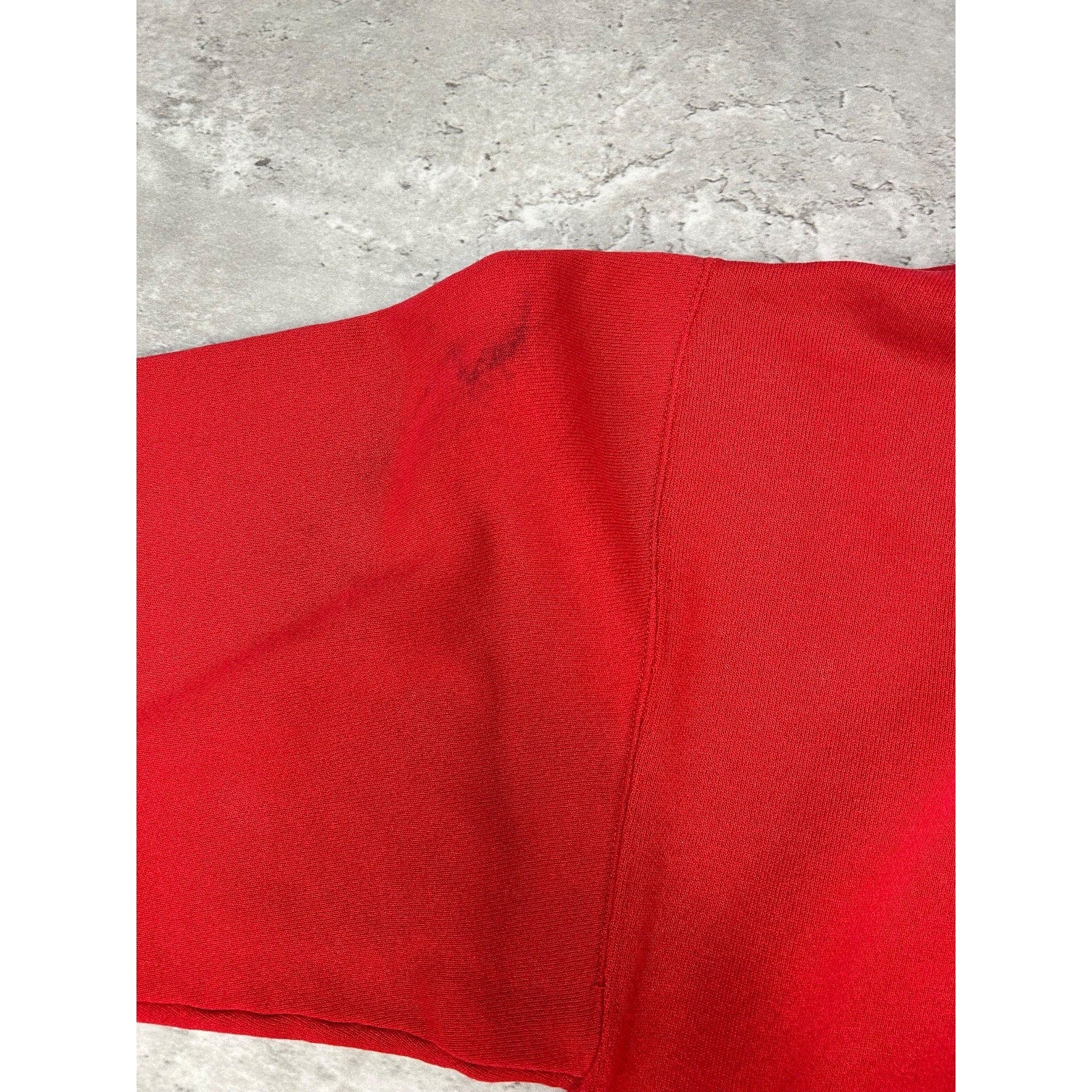 General wear due to age. Cracking on print. Light marks found around. Tear on left cuff seam.