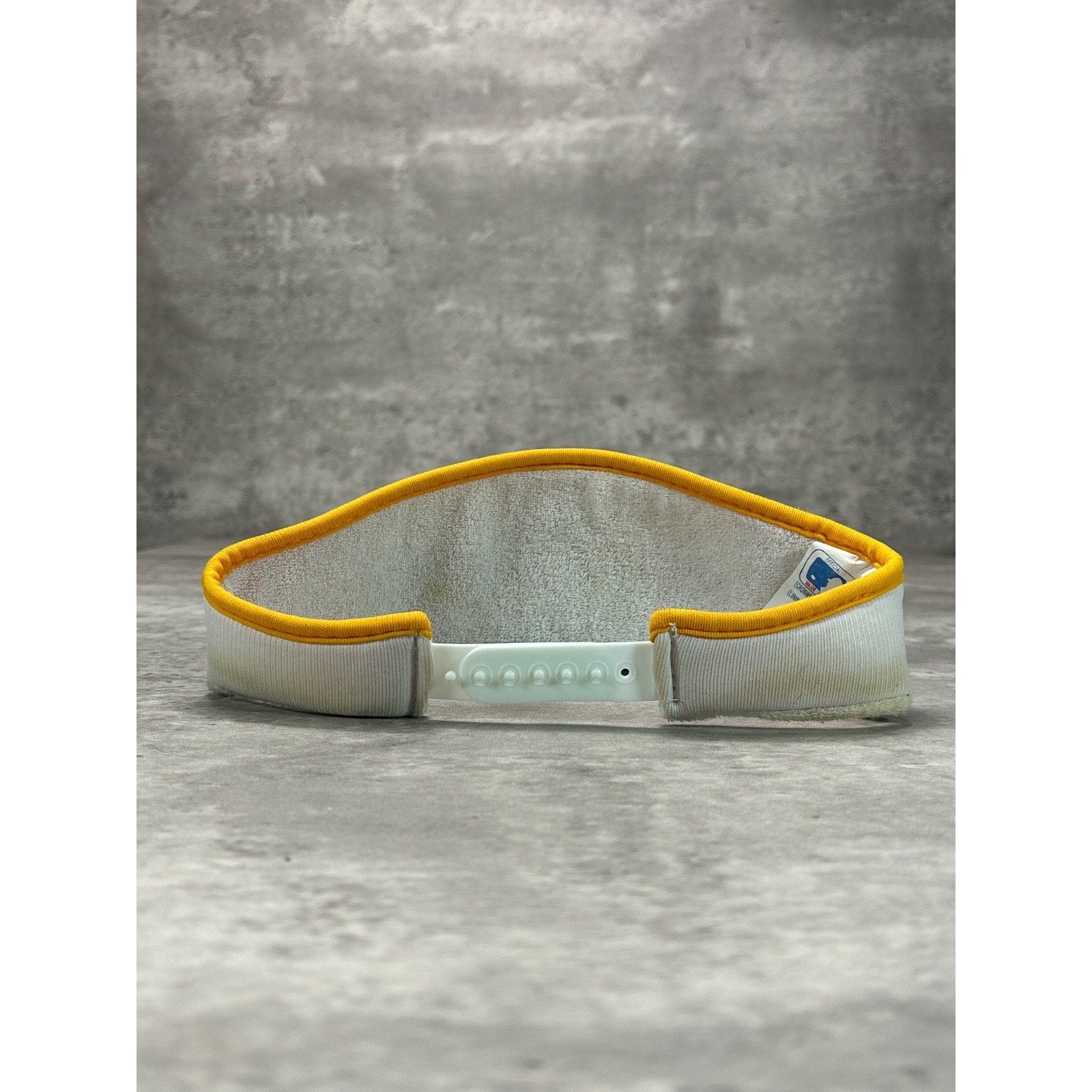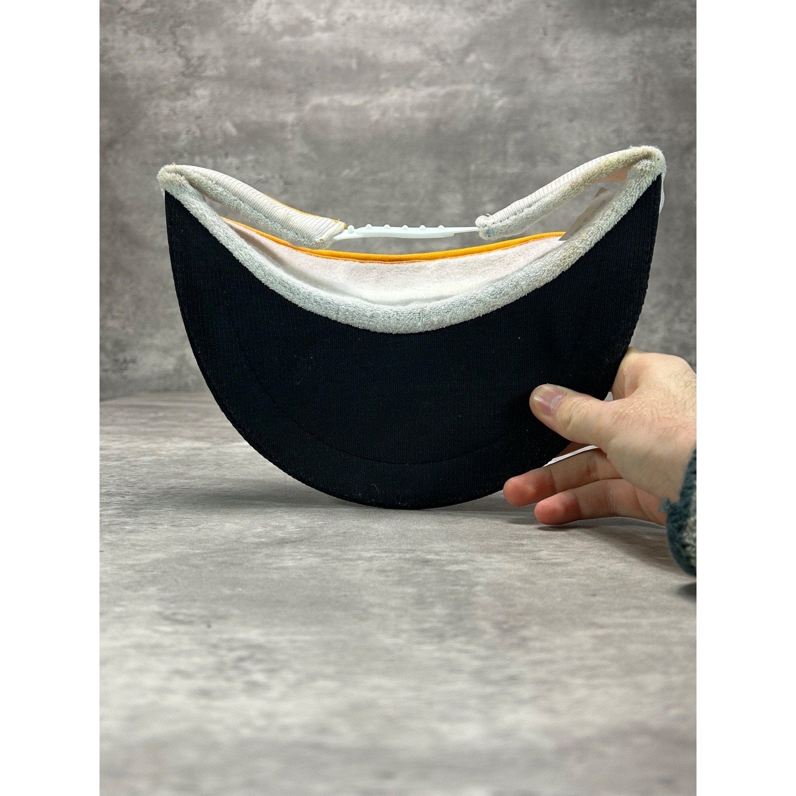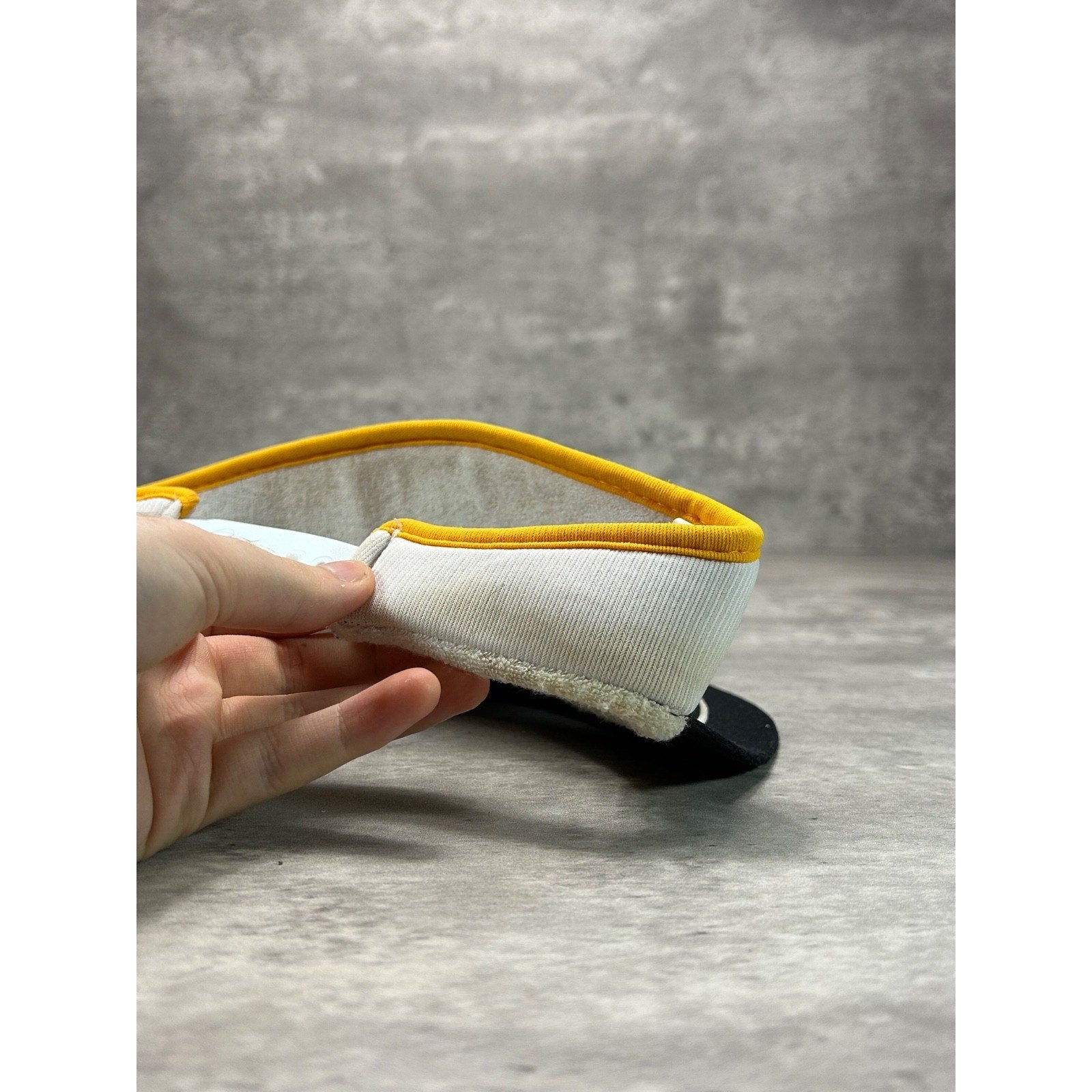 General wear due to age. Light marks on white section and sweatband.