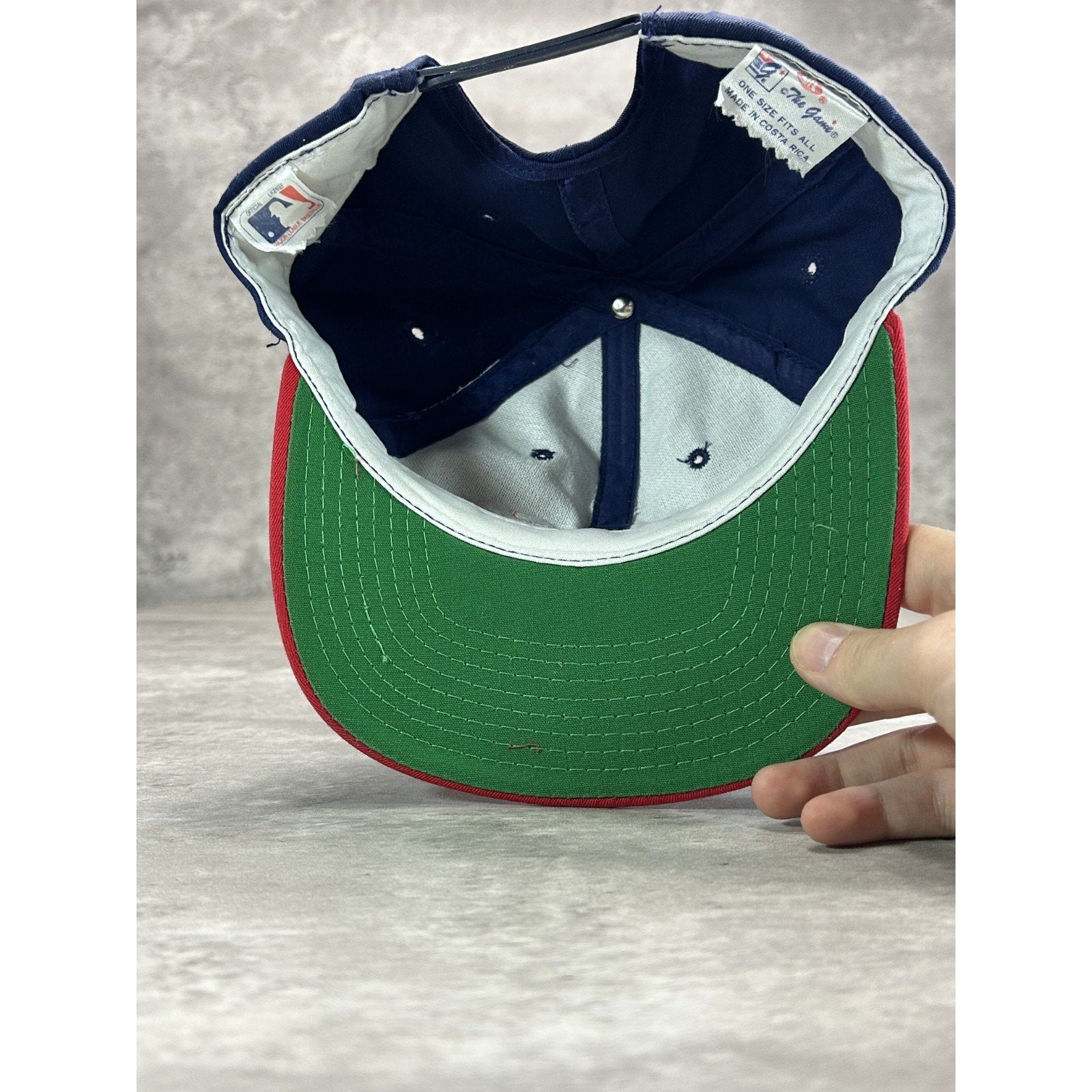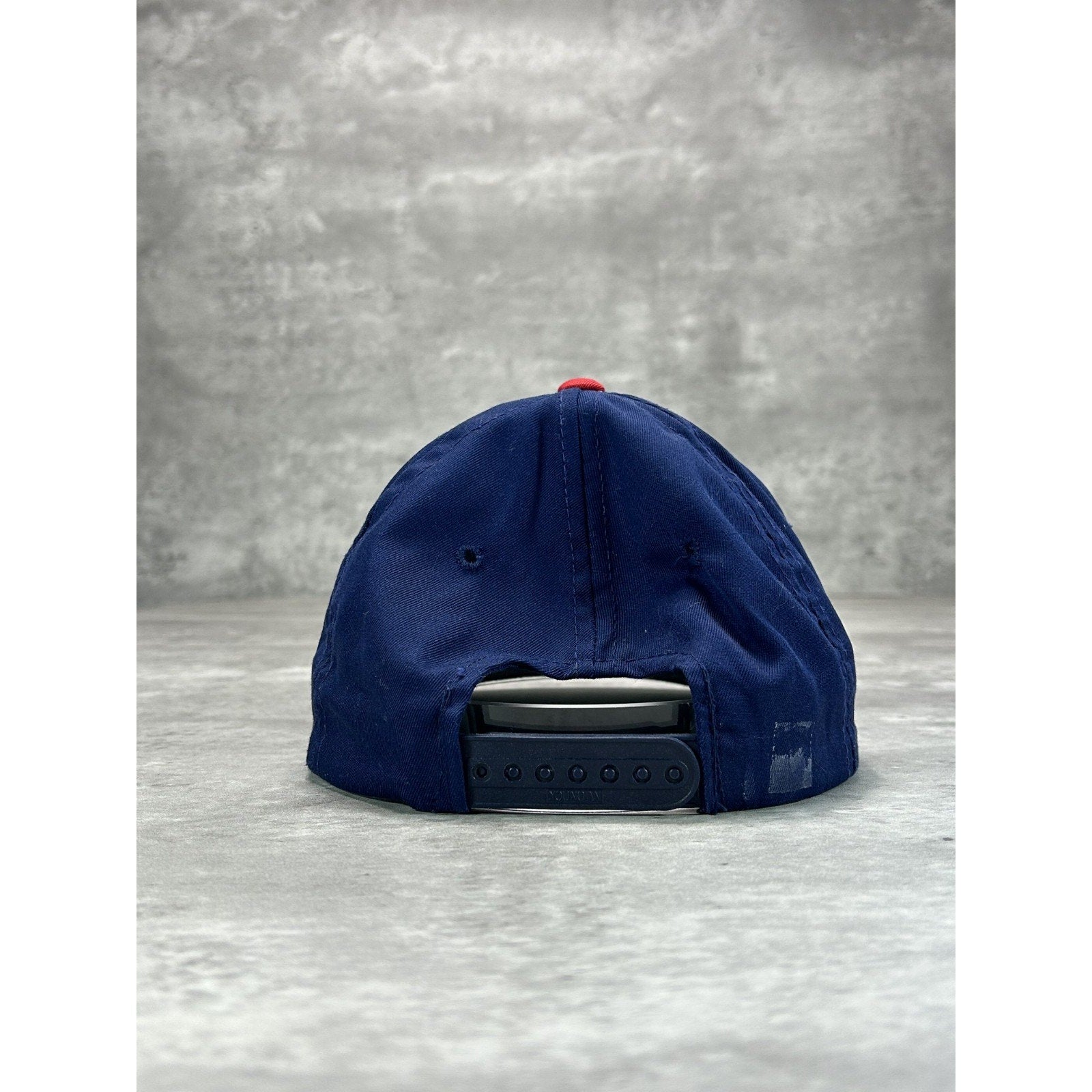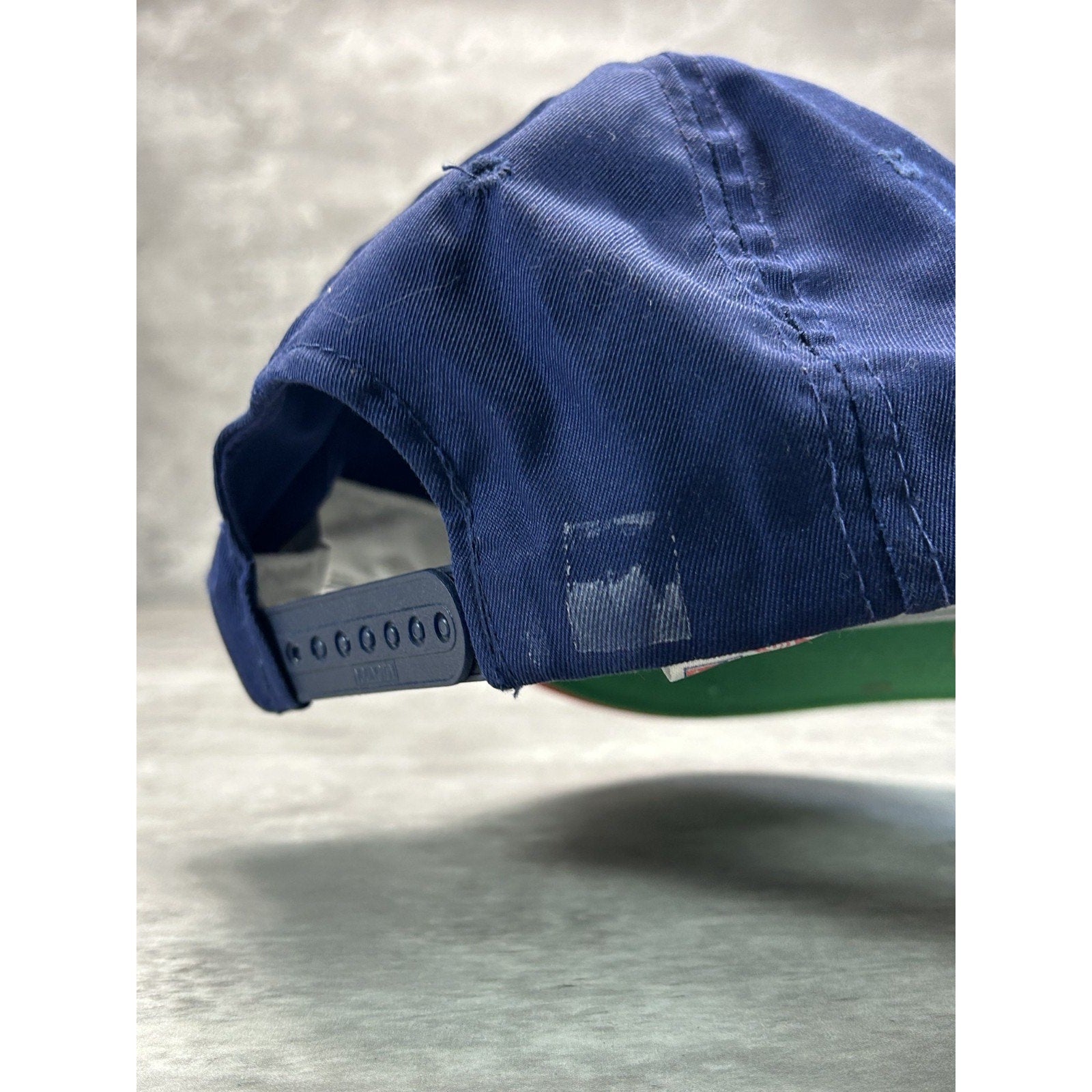 General wear due to age. Minor yellowing on sweatband. Loose threads found around. Fade mark on back near strap.
