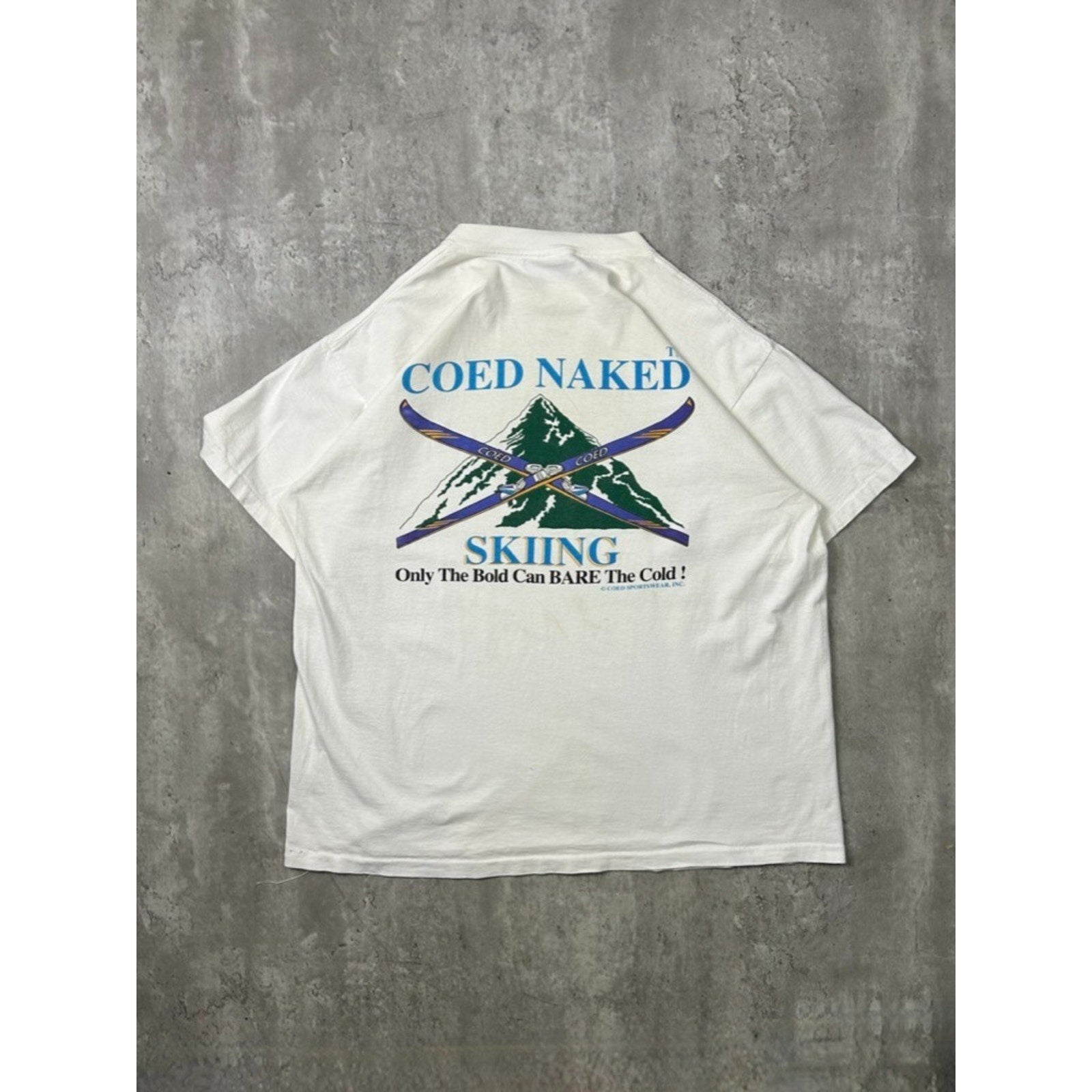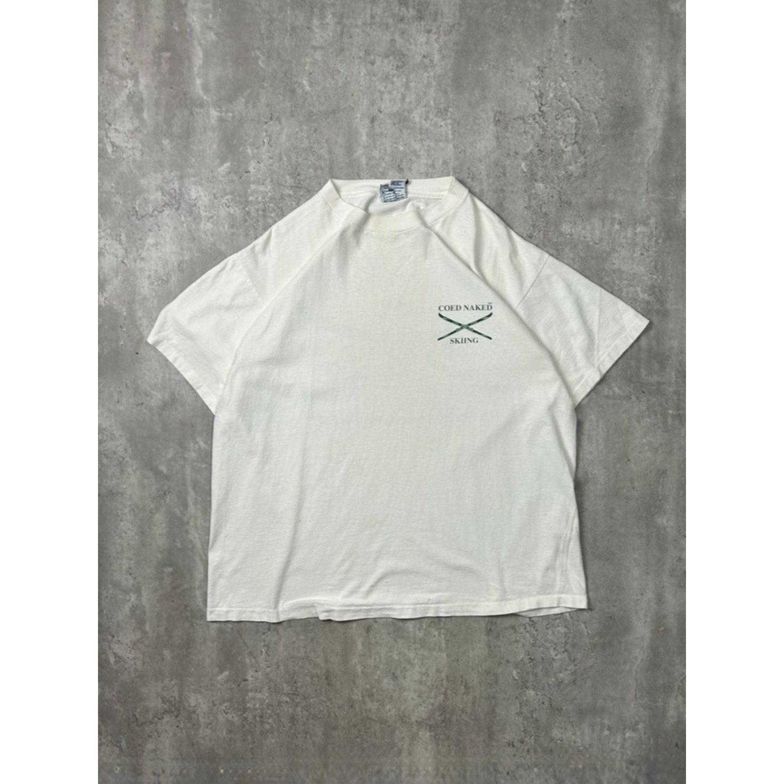 Vintage 90s Coed Naked Skiing Comedy Spellout Graphic T-Shirt Size XL White
