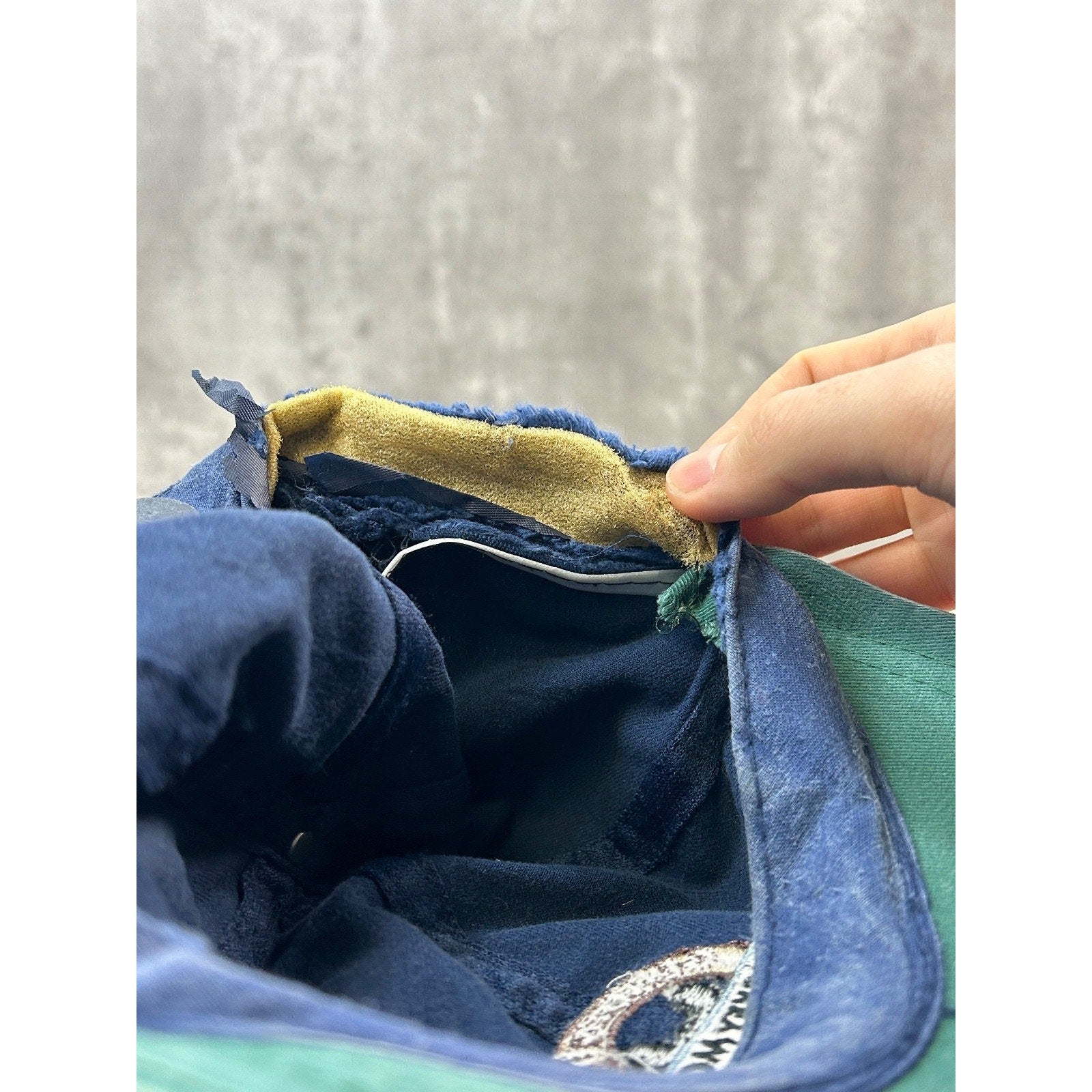 General wear, fading due to age. Marks under brim. Minor creasing on dome and brim. Tears along sweatband.
