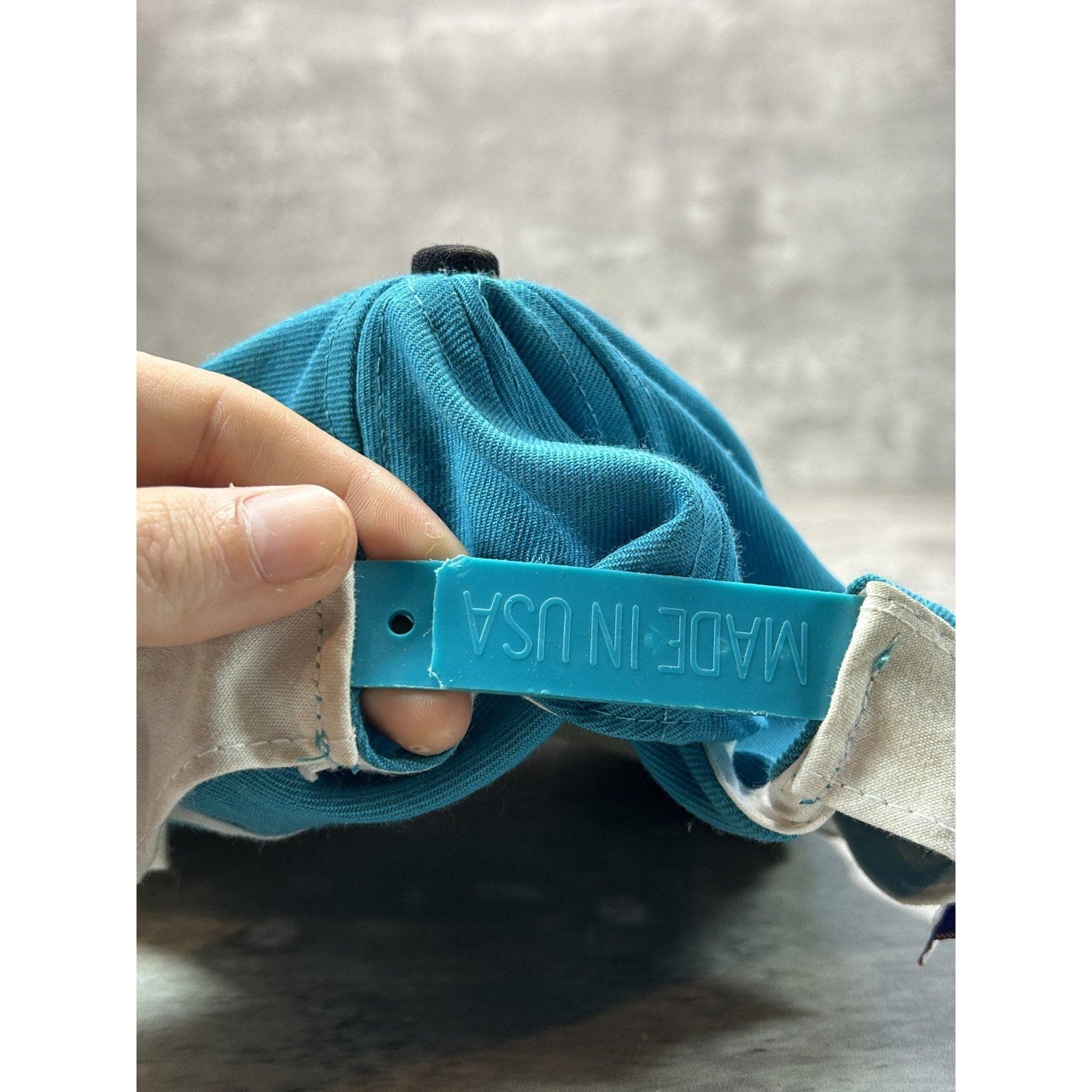 General wear due to age. Minor creasing on dome. Yellowing/light marks under brim and on sweatband. Back portion of snap strap missing.