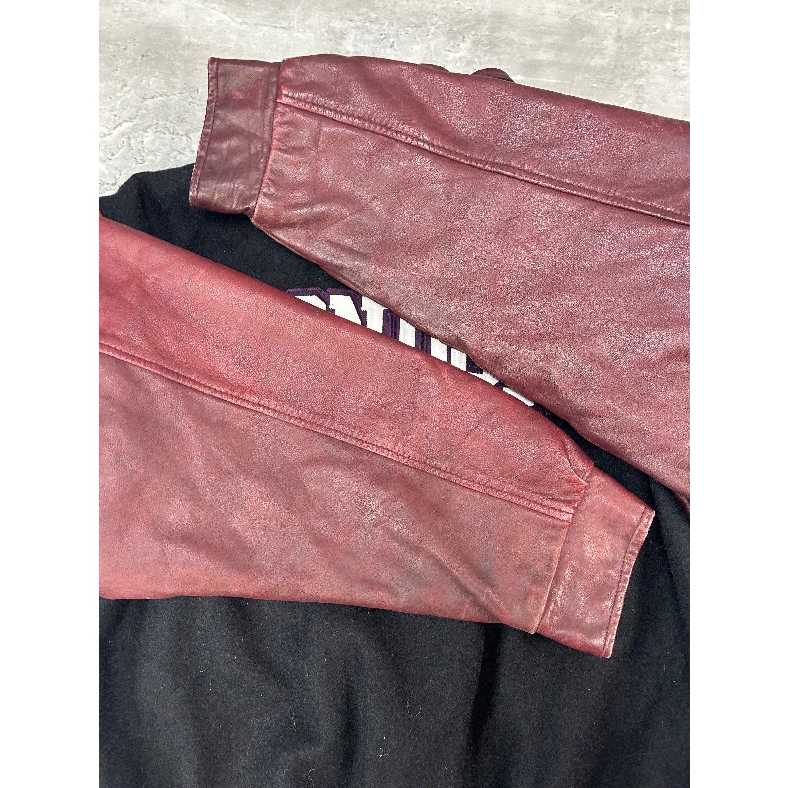 Wear due to age. Light marks and wear on leather sleeves. Pilling found throughout. Tears on left side on jacket.