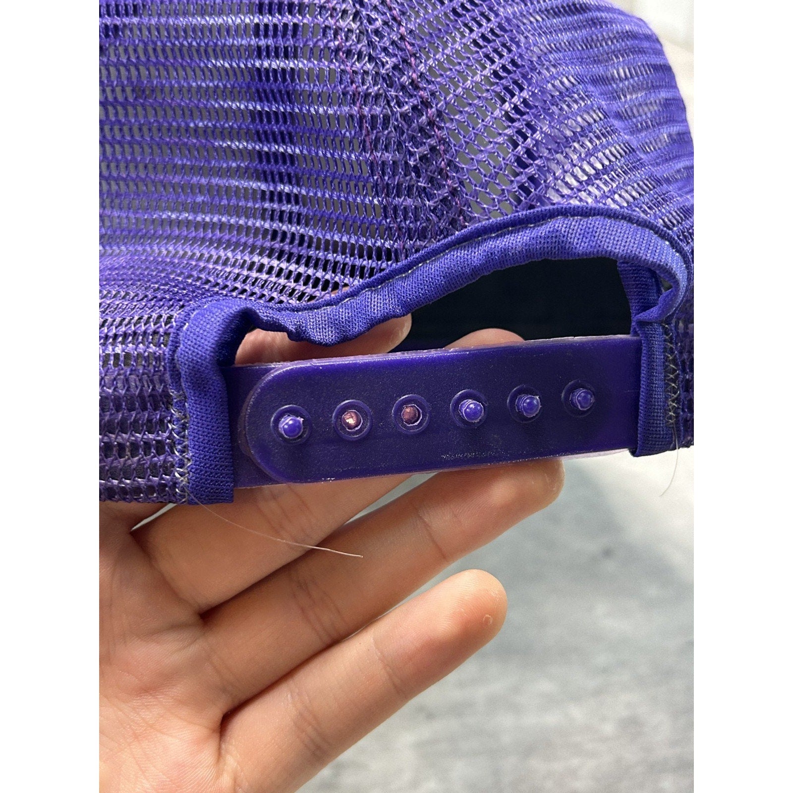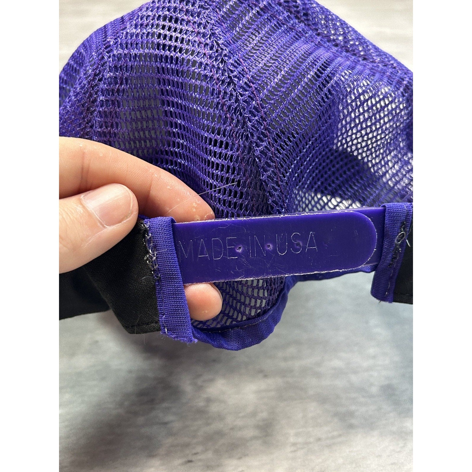 Wear due to age. Loose threads found throughout. Missing two snaps. Creasing on dome and brim. Brim malleable. Marks on brim.