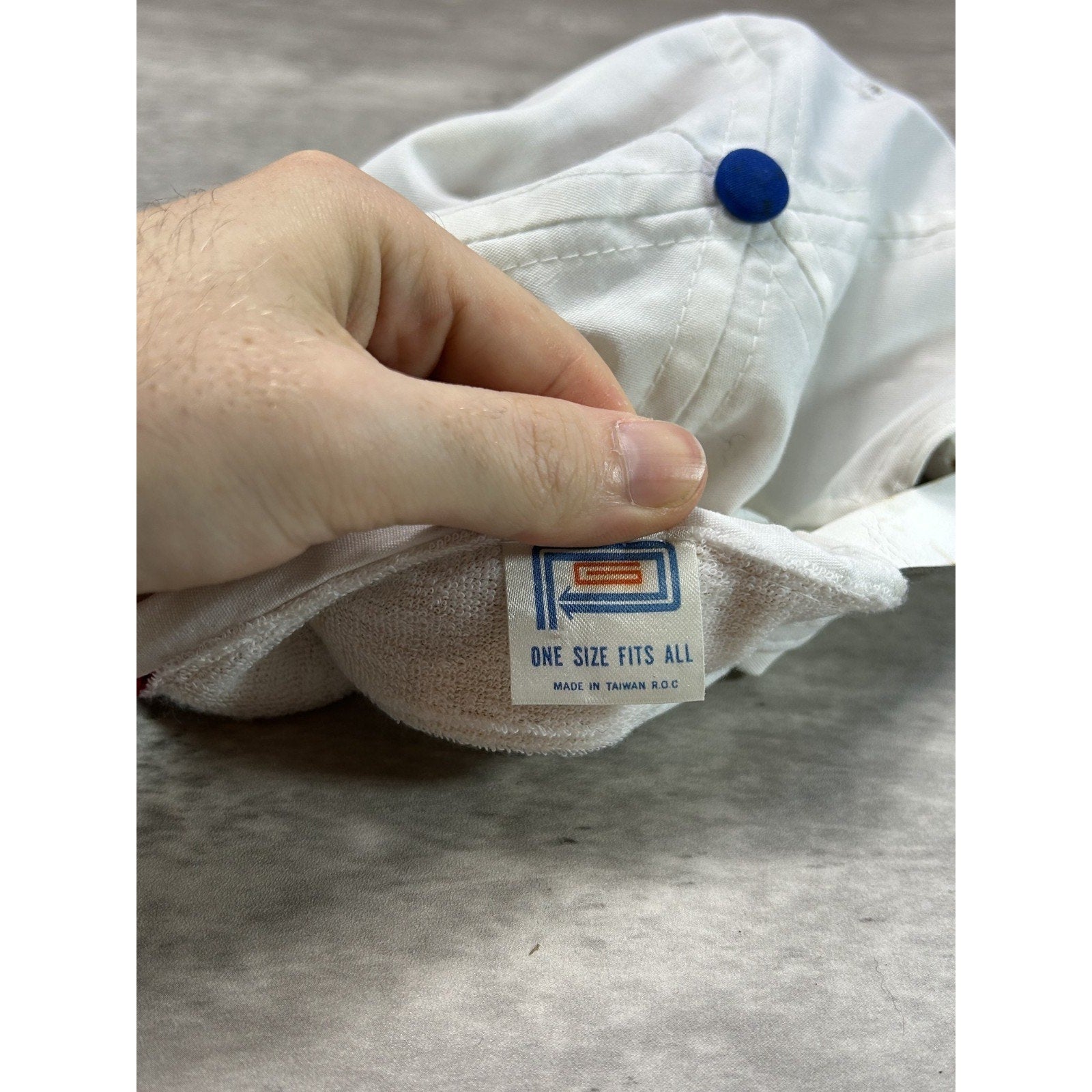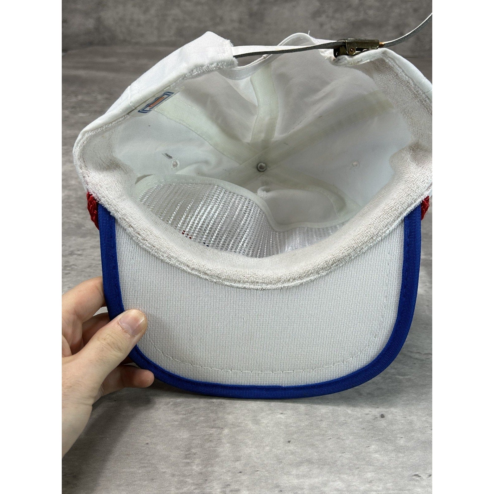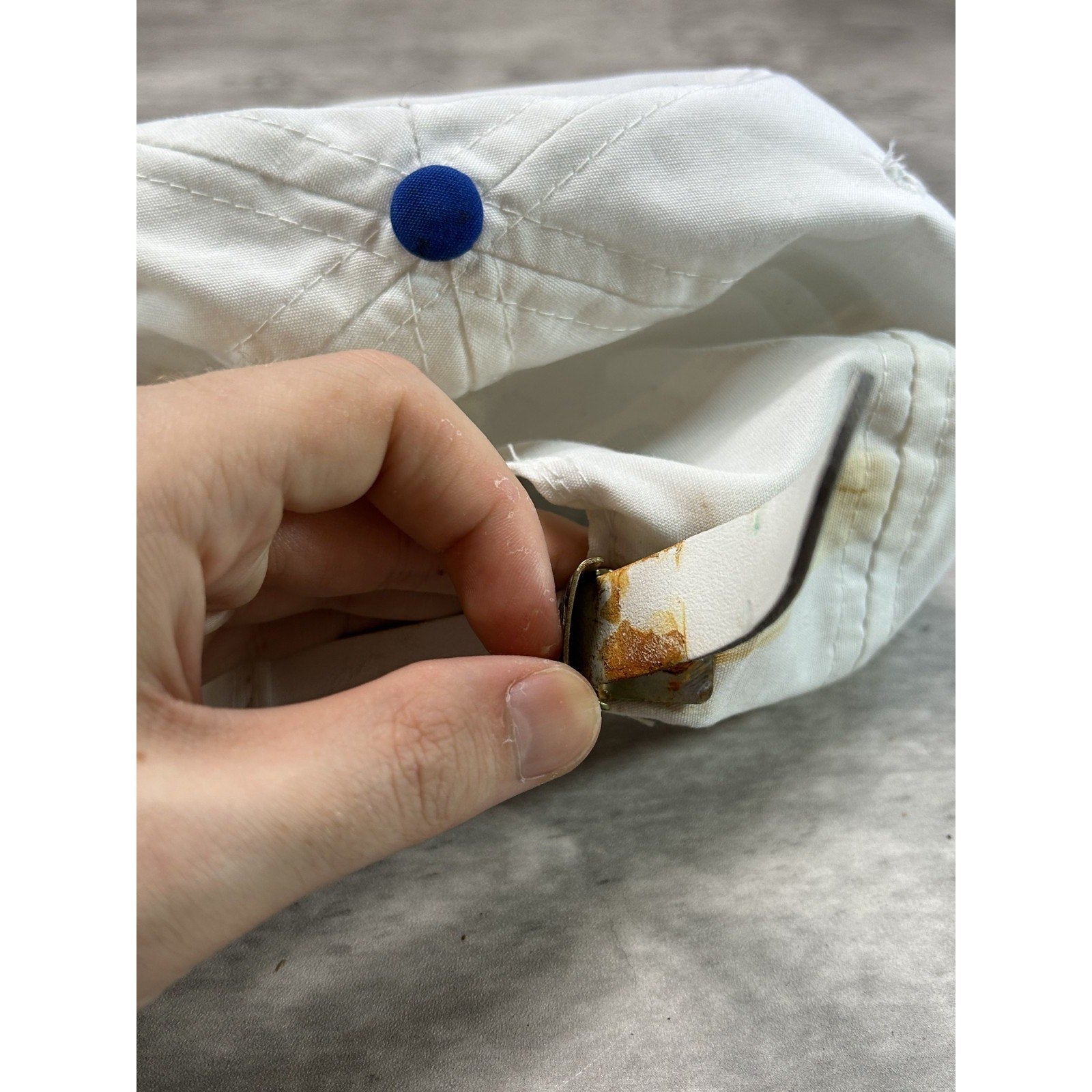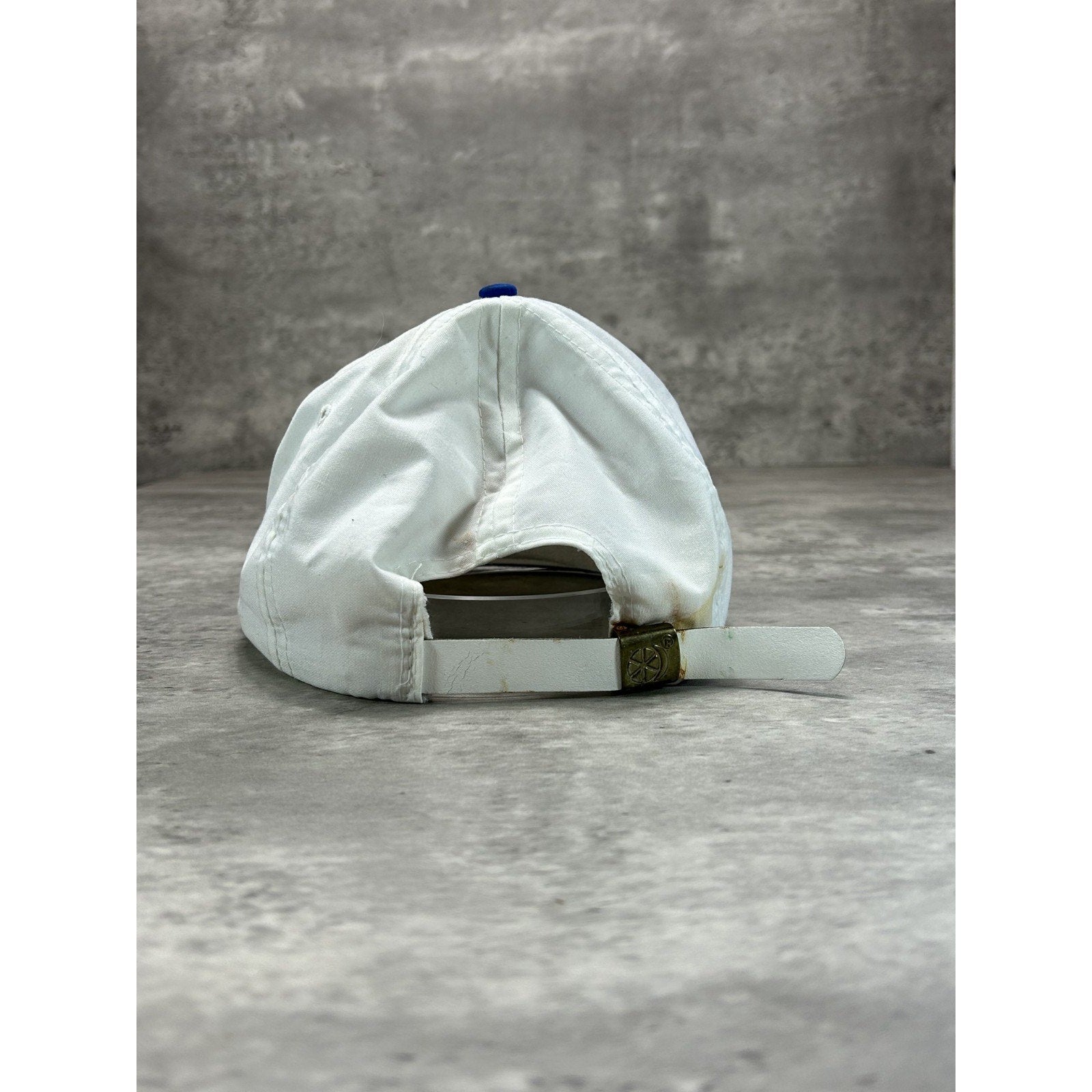 Wear, fading due to age. Yellowing, light marks, color bleeding found throughout. Oxidization on buckle, bleeding onto strap and dome. Loose stitching on brim.