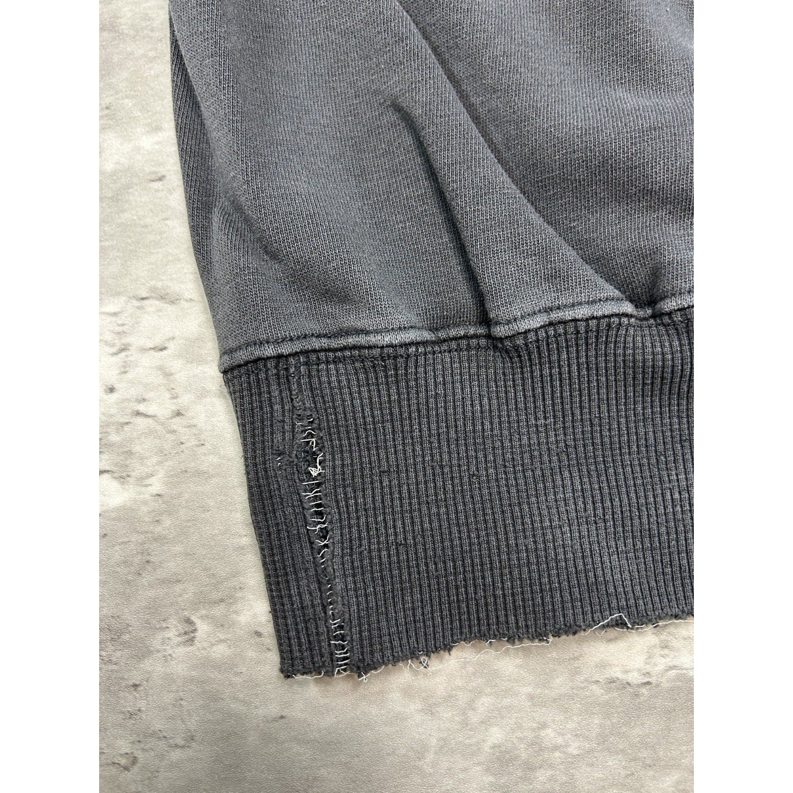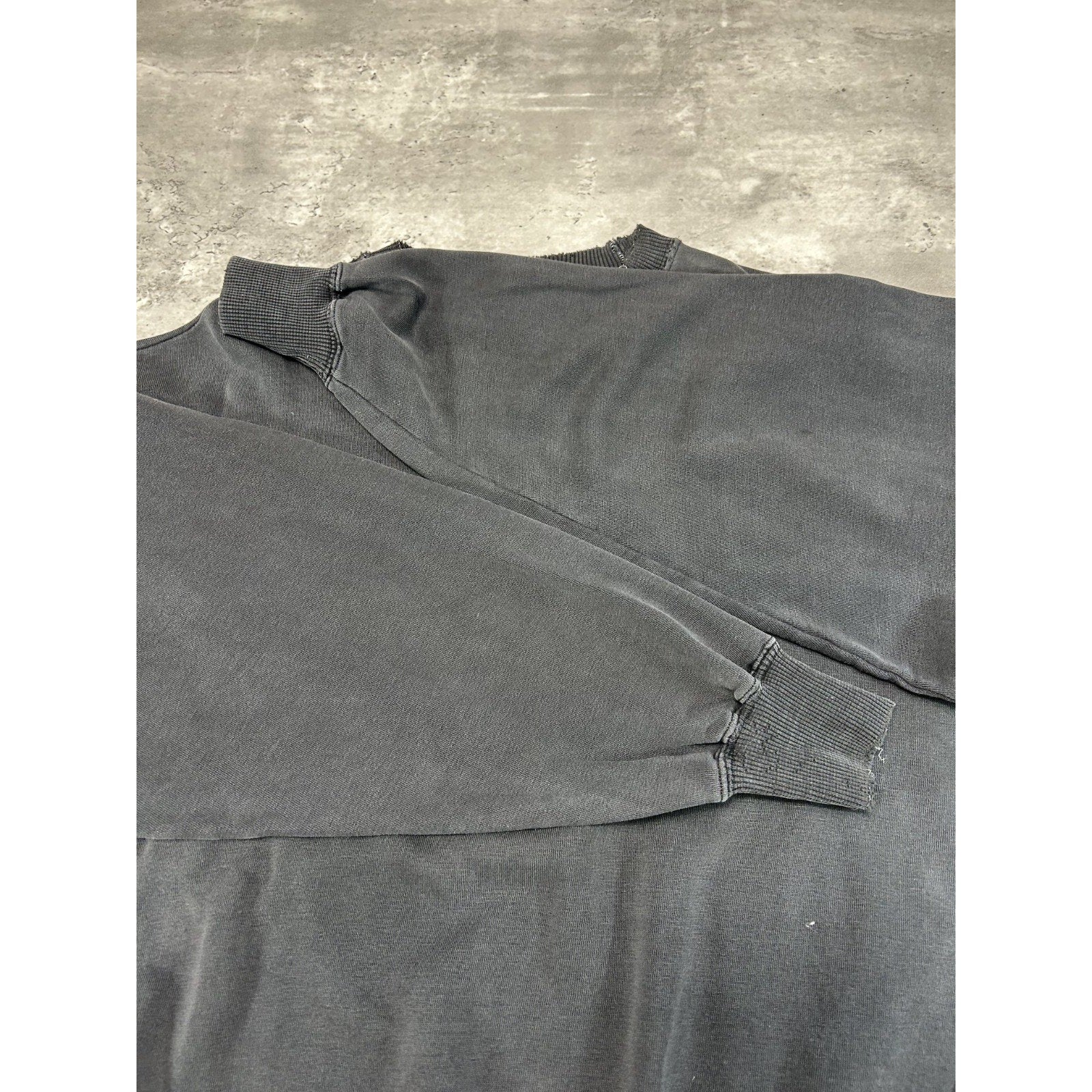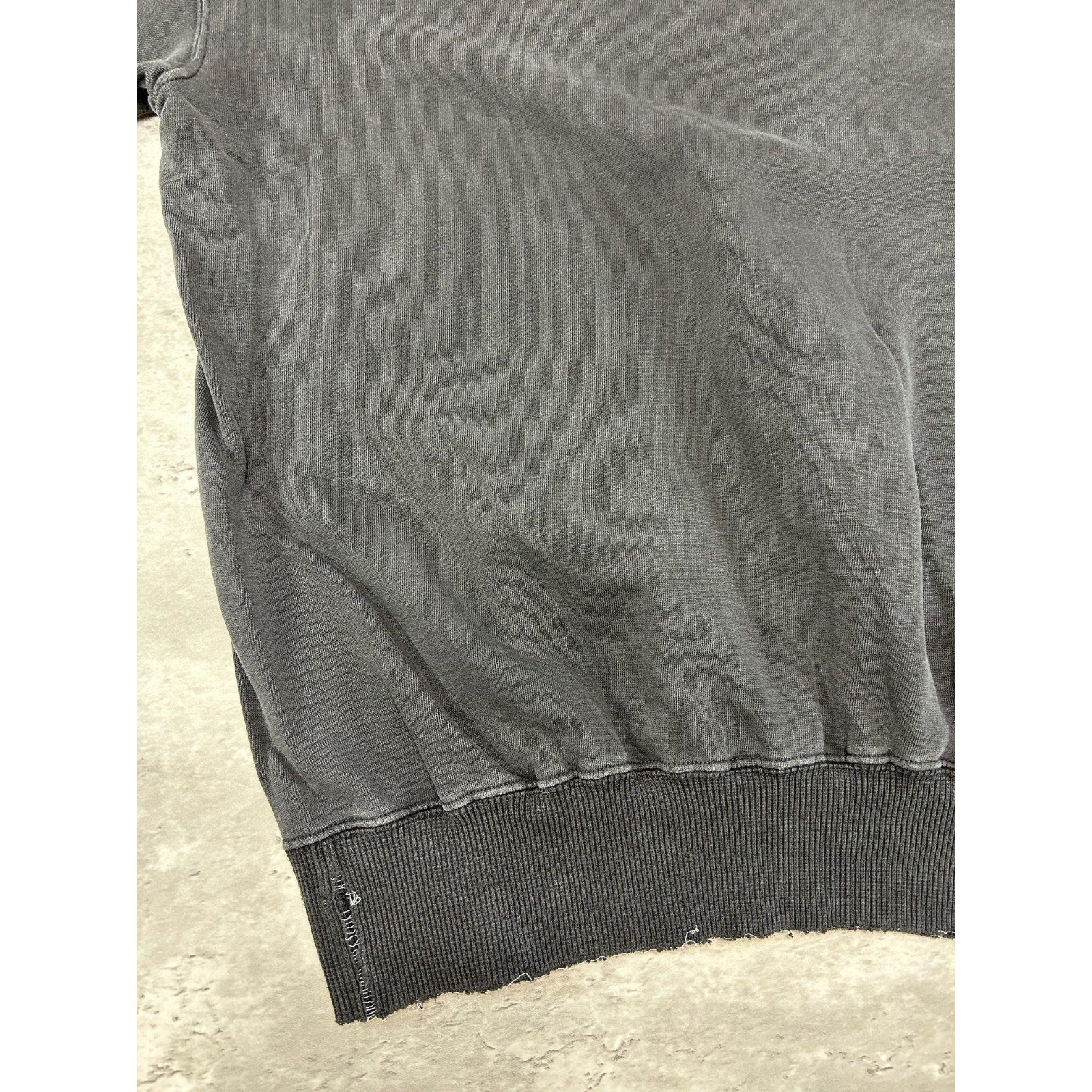 General wear, fading due to age. Fraying and distressing found around. Thread pulls on embroidery. Elastic threads coming loose on collar, cuffs, and waistband, resulting in pinholes and tears.
