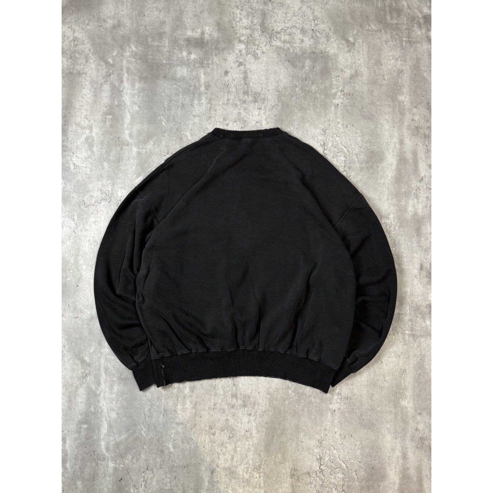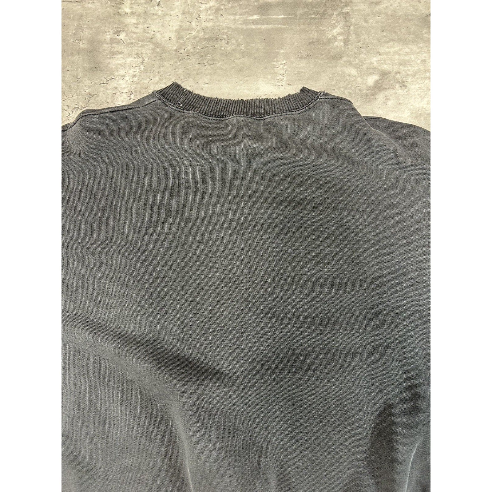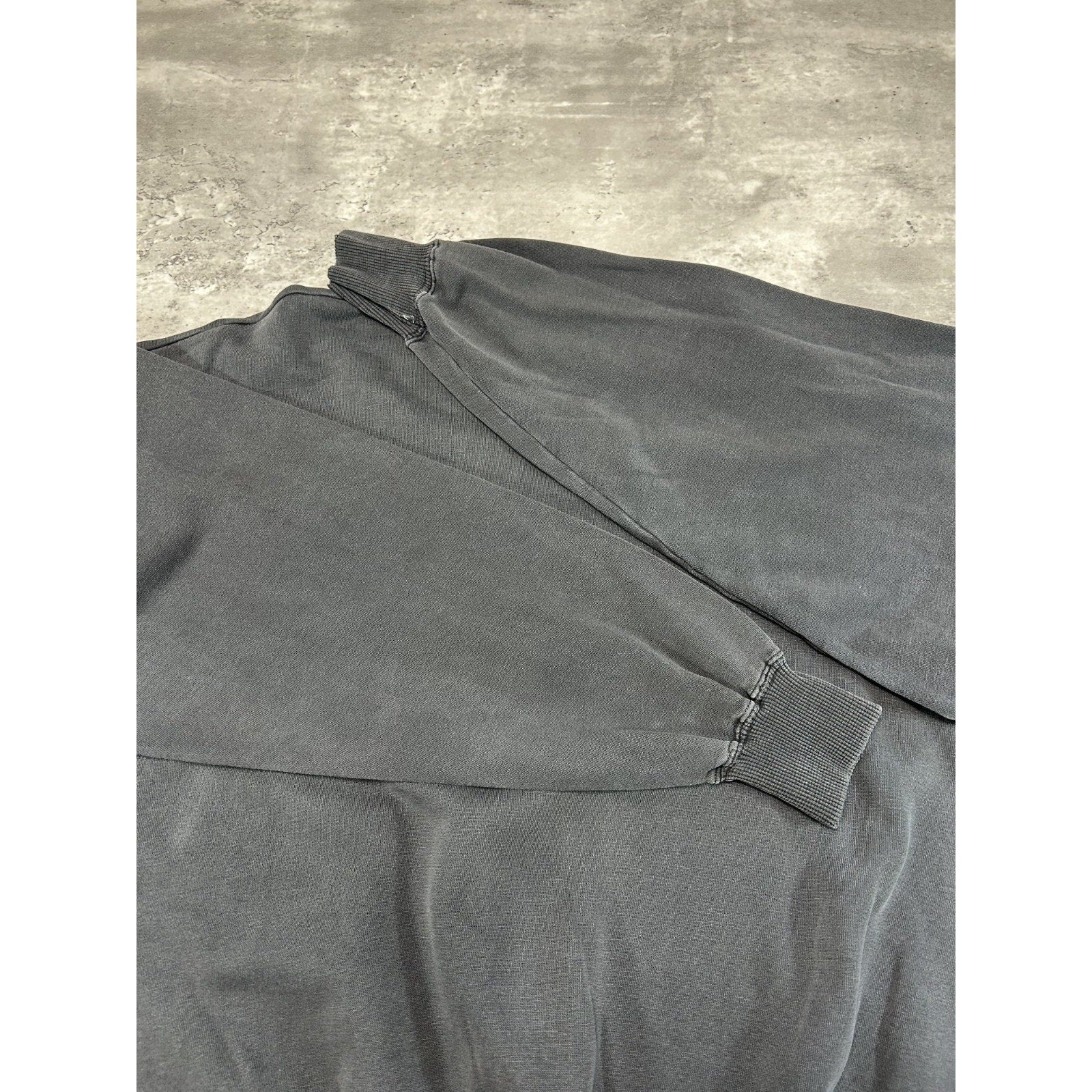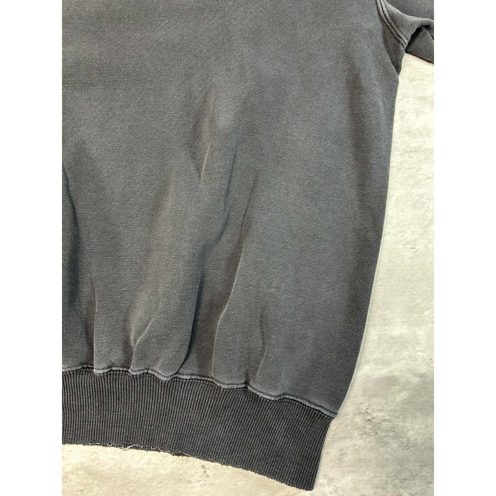 General wear, fading due to age. Fraying and distressing found around. Thread pulls on embroidery. Elastic threads coming loose on collar, cuffs, and waistband, resulting in pinholes and tears.