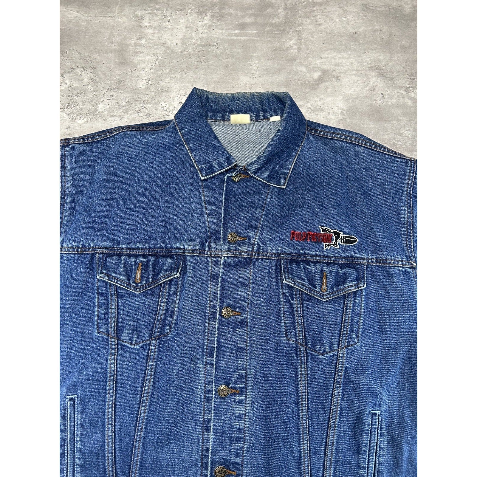 Vintage 90s Pulp Fiction Embroidered Movie Promo Denim Jacket Size XL Blue