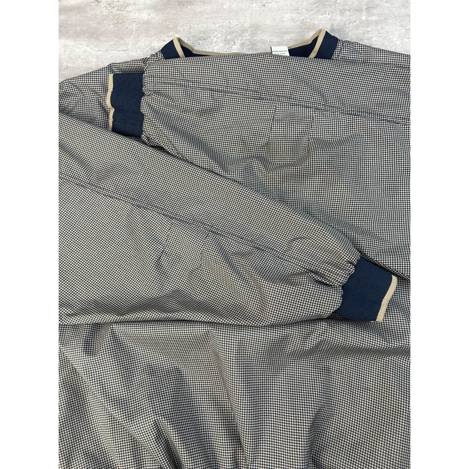 General wear due to age. Light marks found around. Pilling on collar, cuffs, and waistband.