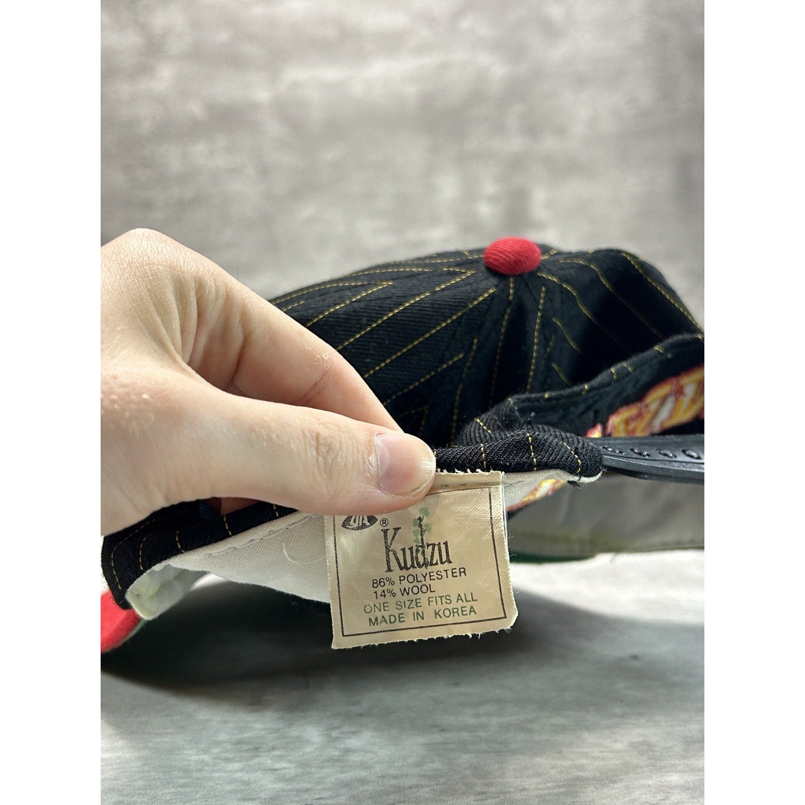 General wear due to age. Creasing on dome. Yellowing/light marks on sweatband.