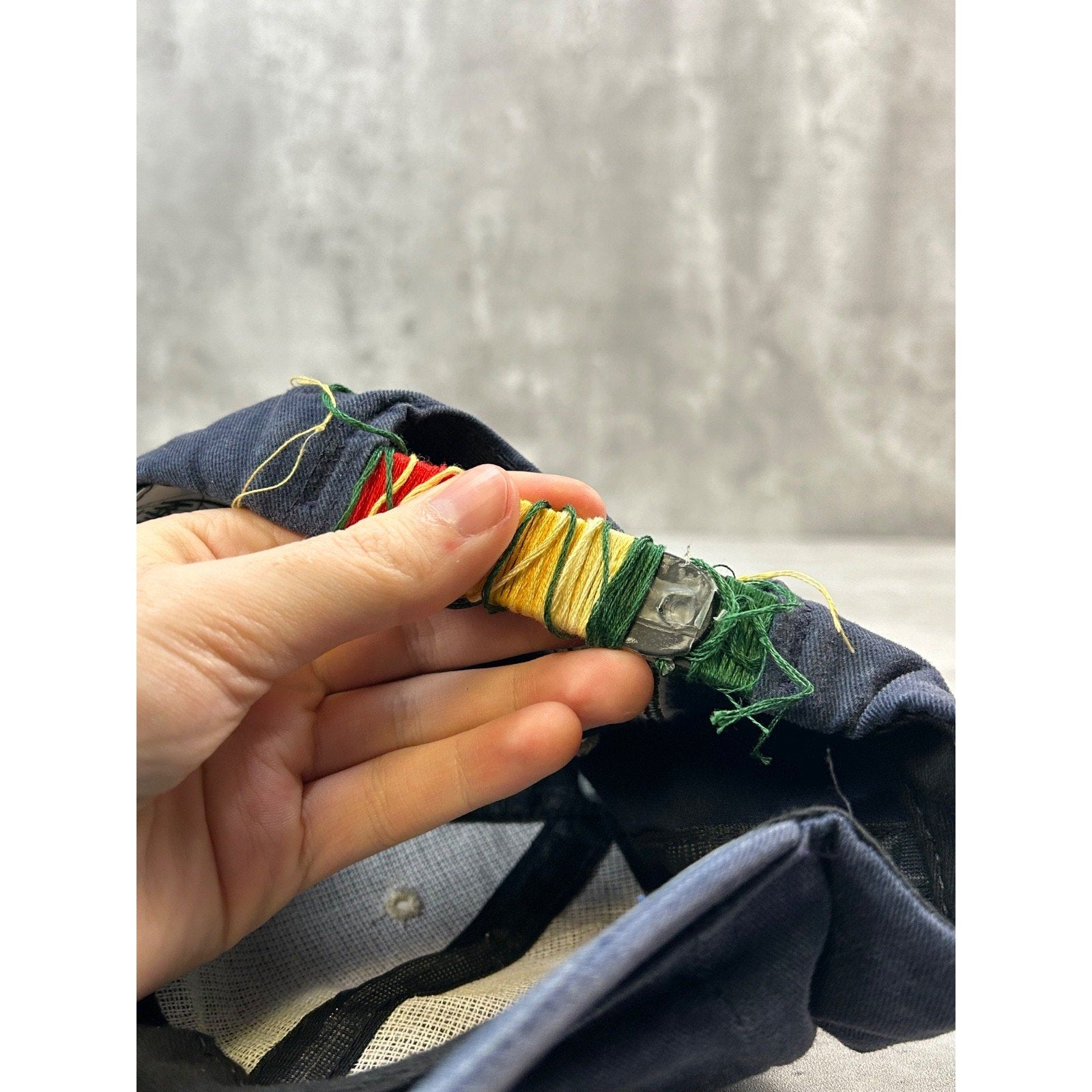General wear, fading due to age. Light marks found around. Snaps broken, covered with threads by previous owner.