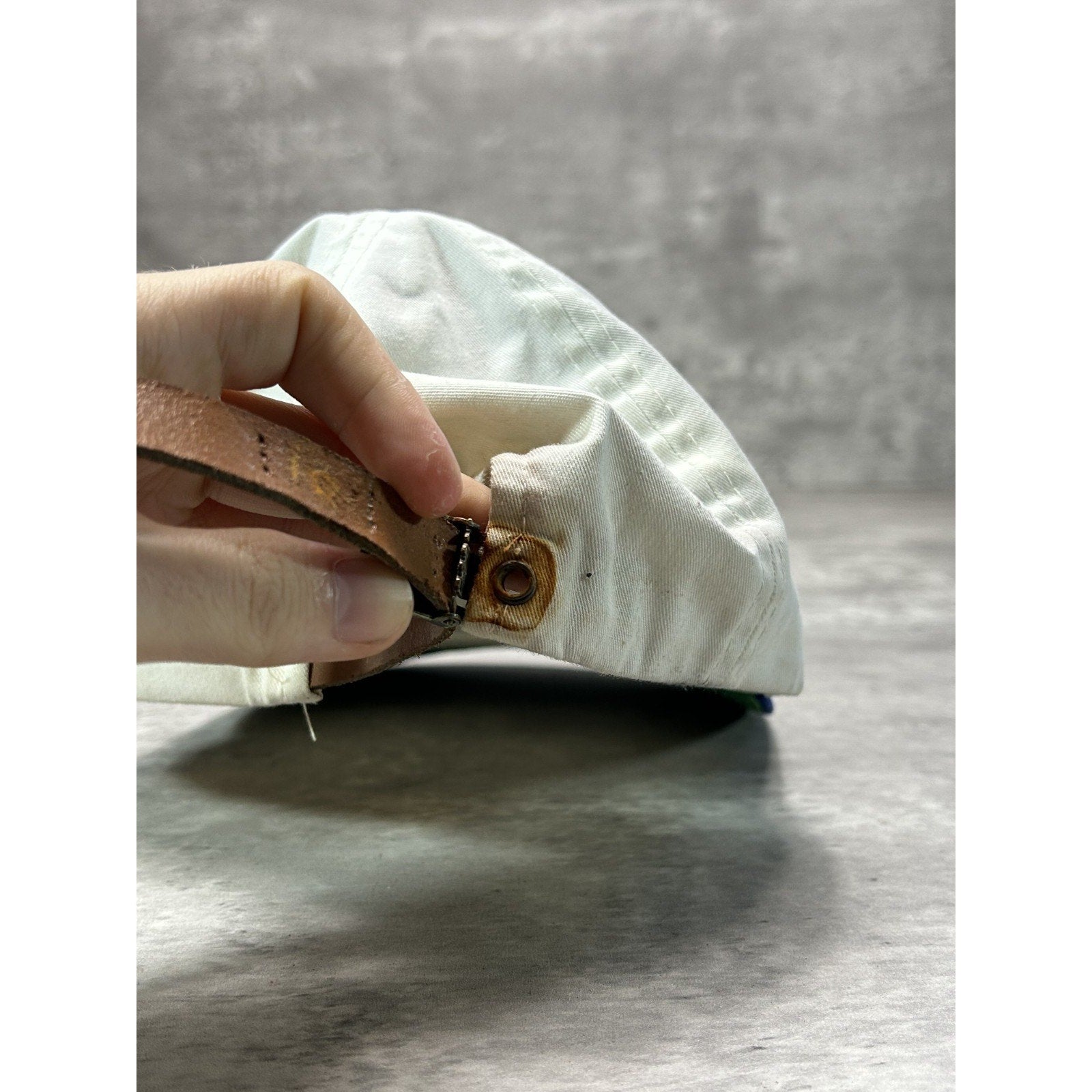 General wear, fading due to age. Light marks on dome. Creasing on dome. Loose threads found around. Leather strap stiff. Oxidization marks on strap buckle. Wear on leather strap. Mark on sweatband.