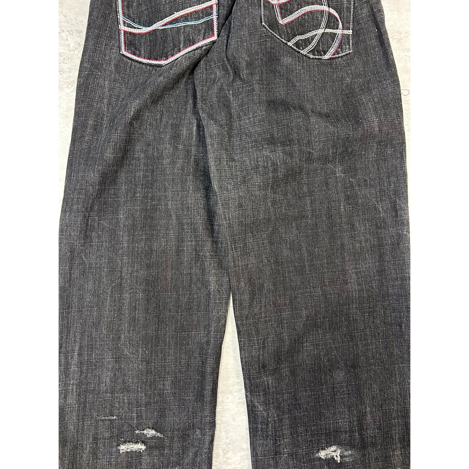 Wear due to age. Tears and distressing on back of legs. Tear on right pocket seam. Loose threads found around.