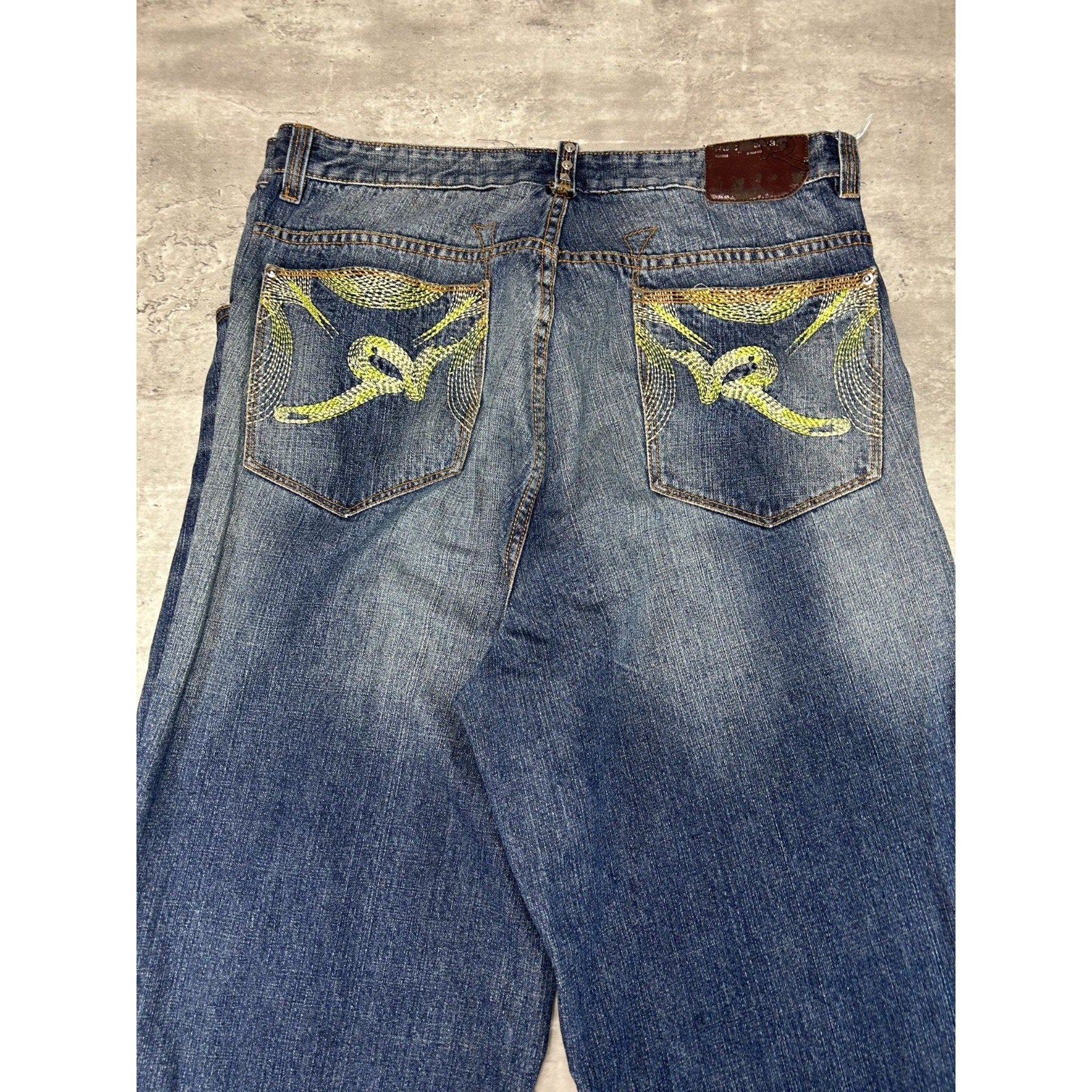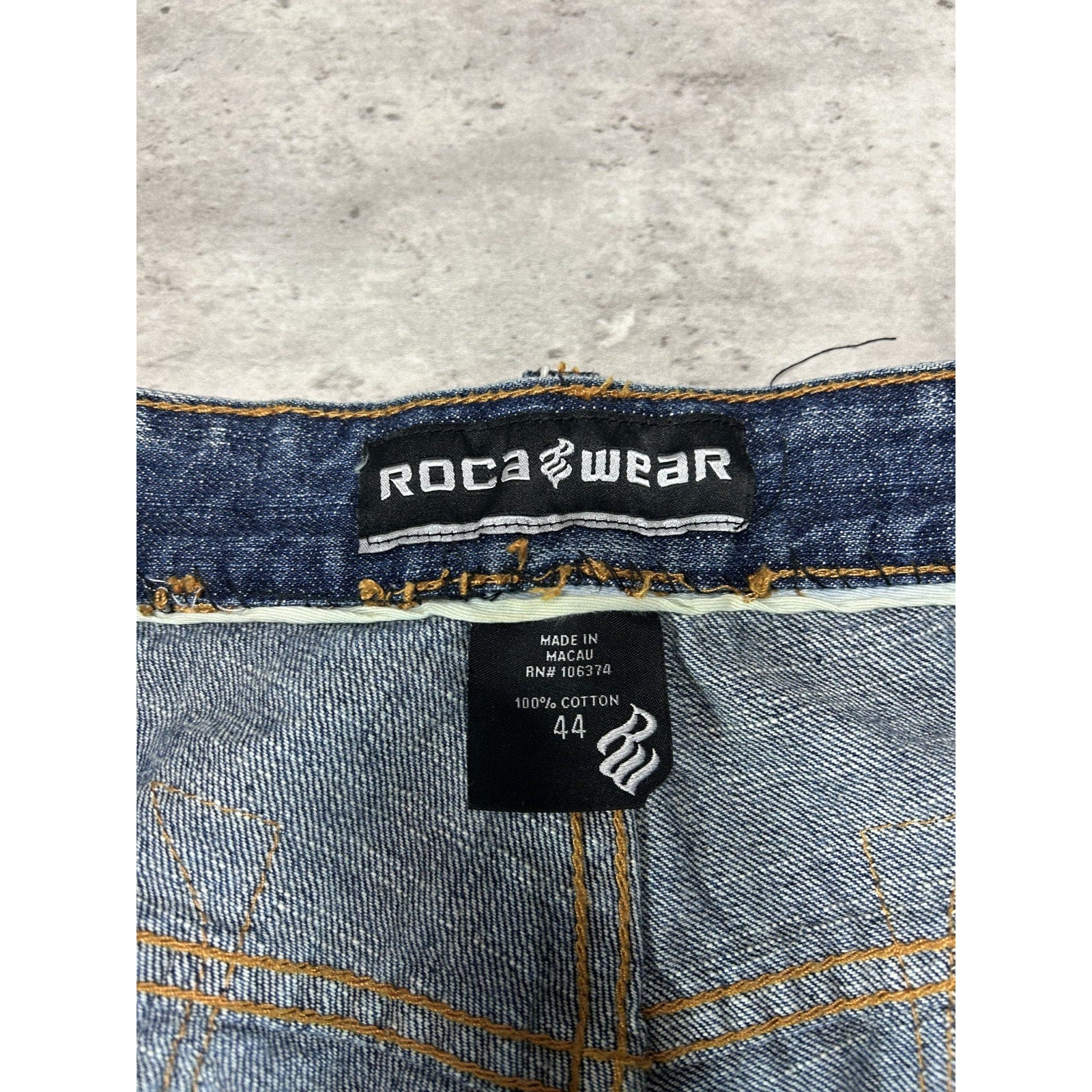 Vintage Y2K Rocawear Baggy Fit Embroidered Pocket Dark Wash Denim Pants Size 38