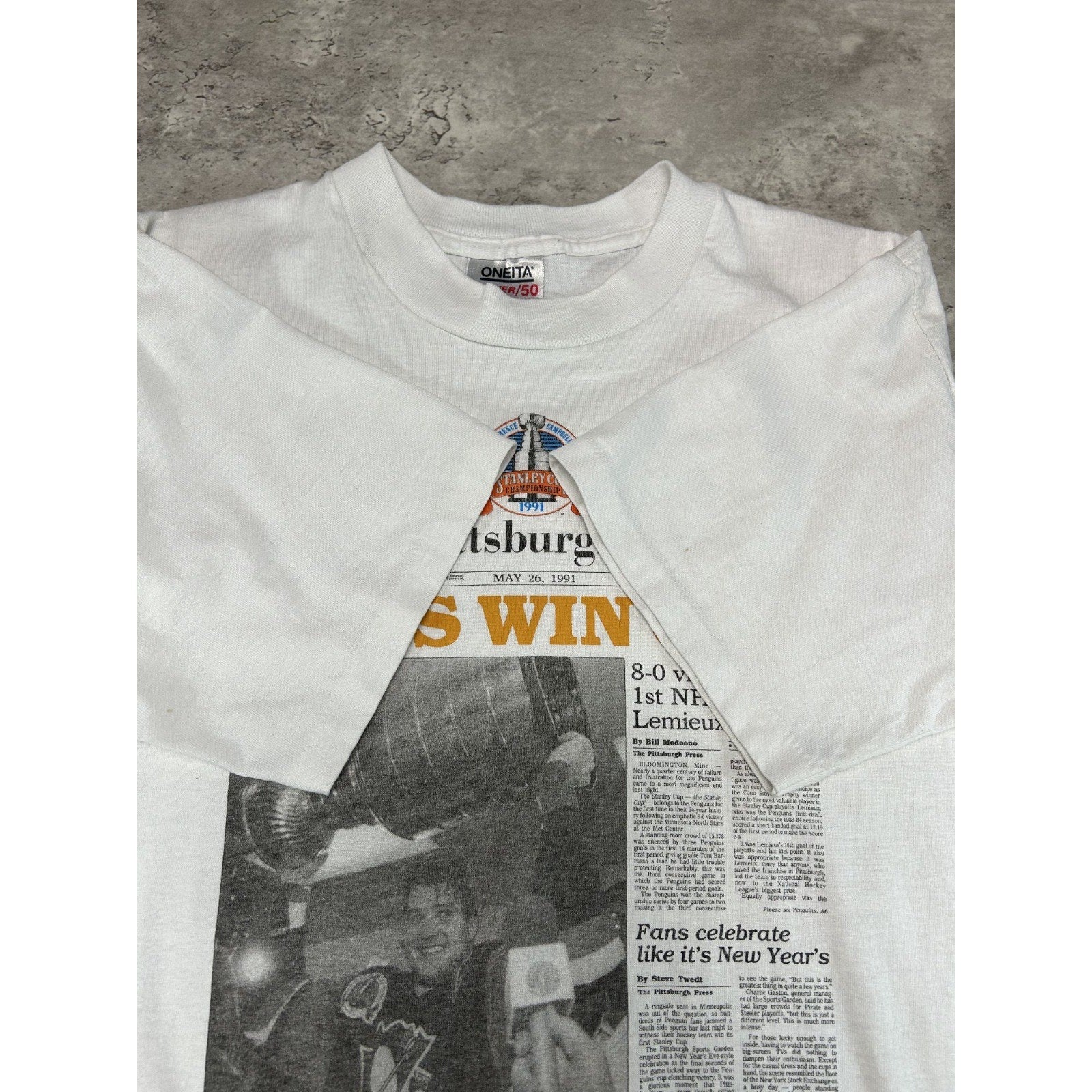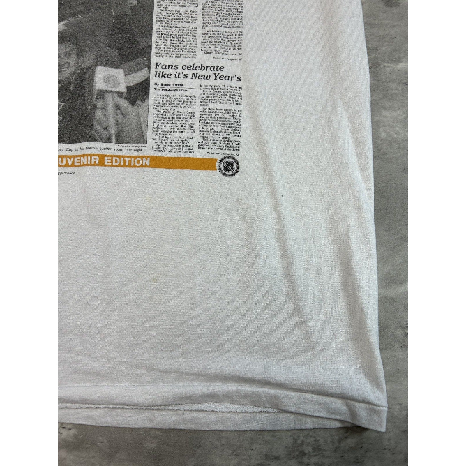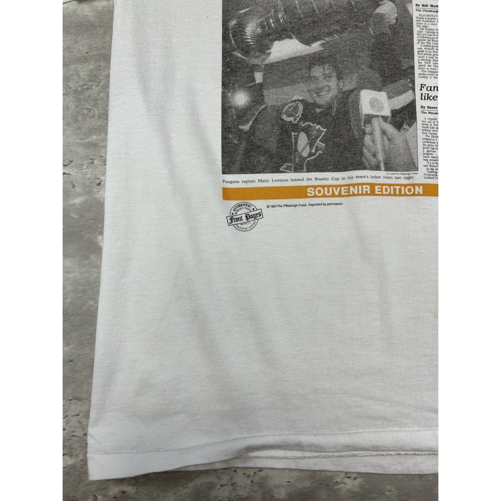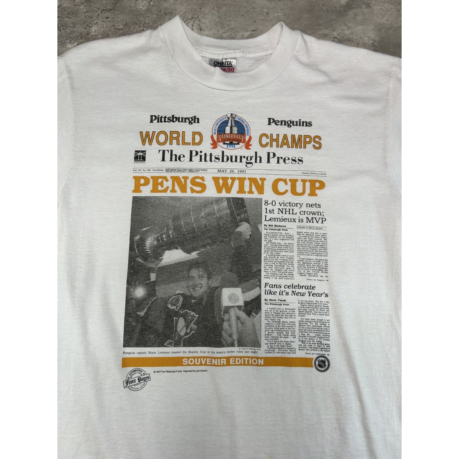VTG 1991 Pittsburgh Penguins NHL Stanley Cup Champs Newspaper T-Shirt Sz Large